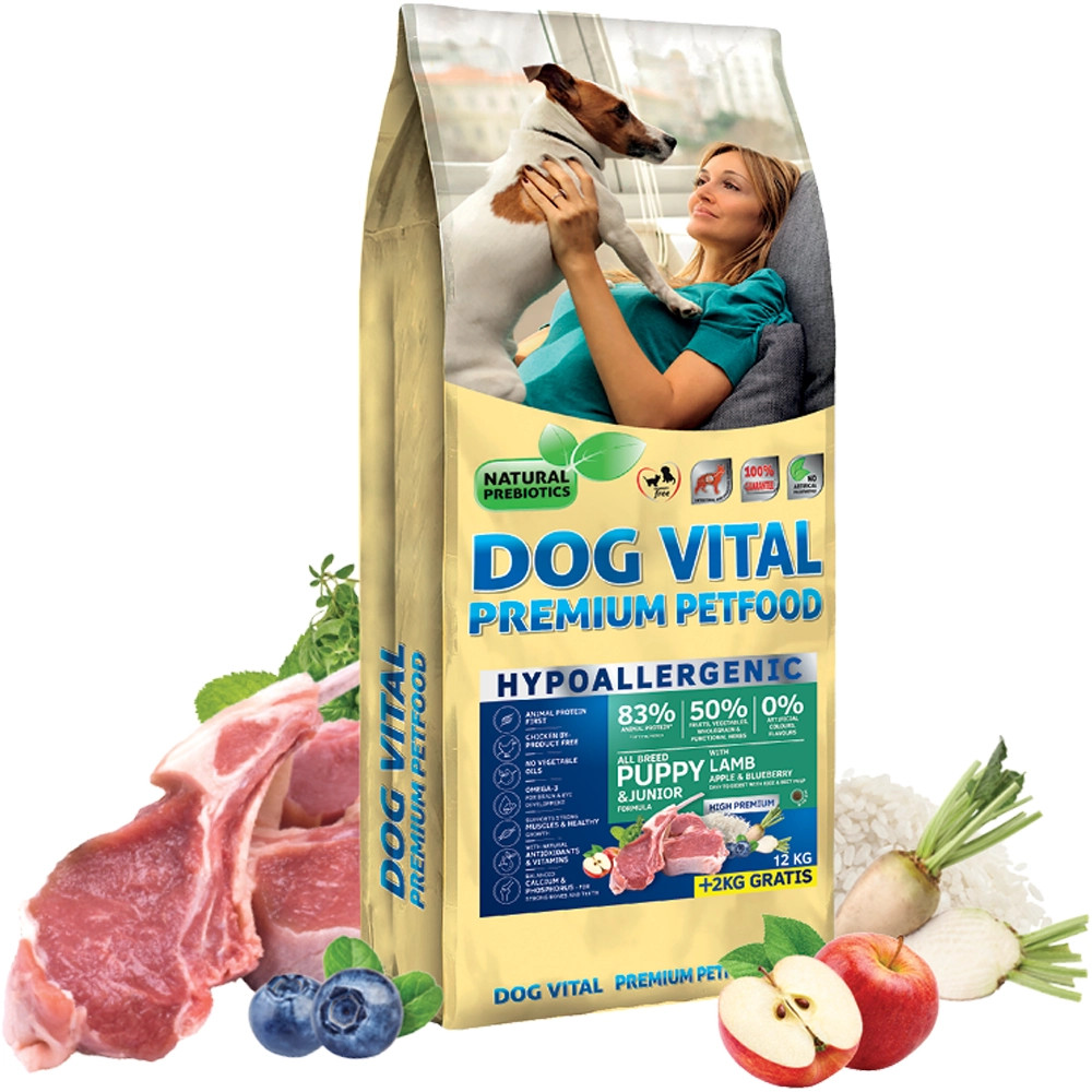 A Dog Vital Hypoallergen Puppy & Junior báránnyal, almával és áfonyával teljes értékű, hipoallergén szárazeledel kölyök- és fiatal kutyáknak, bármely fajtának és testméretnek. Kifejezetten az érzékeny emésztés támogatására készült, jól emészthető bárányfehérjével és rizzsel, hogy kölyökkutyája már a kezdetektől gyomorbarát tápot kaphasson.