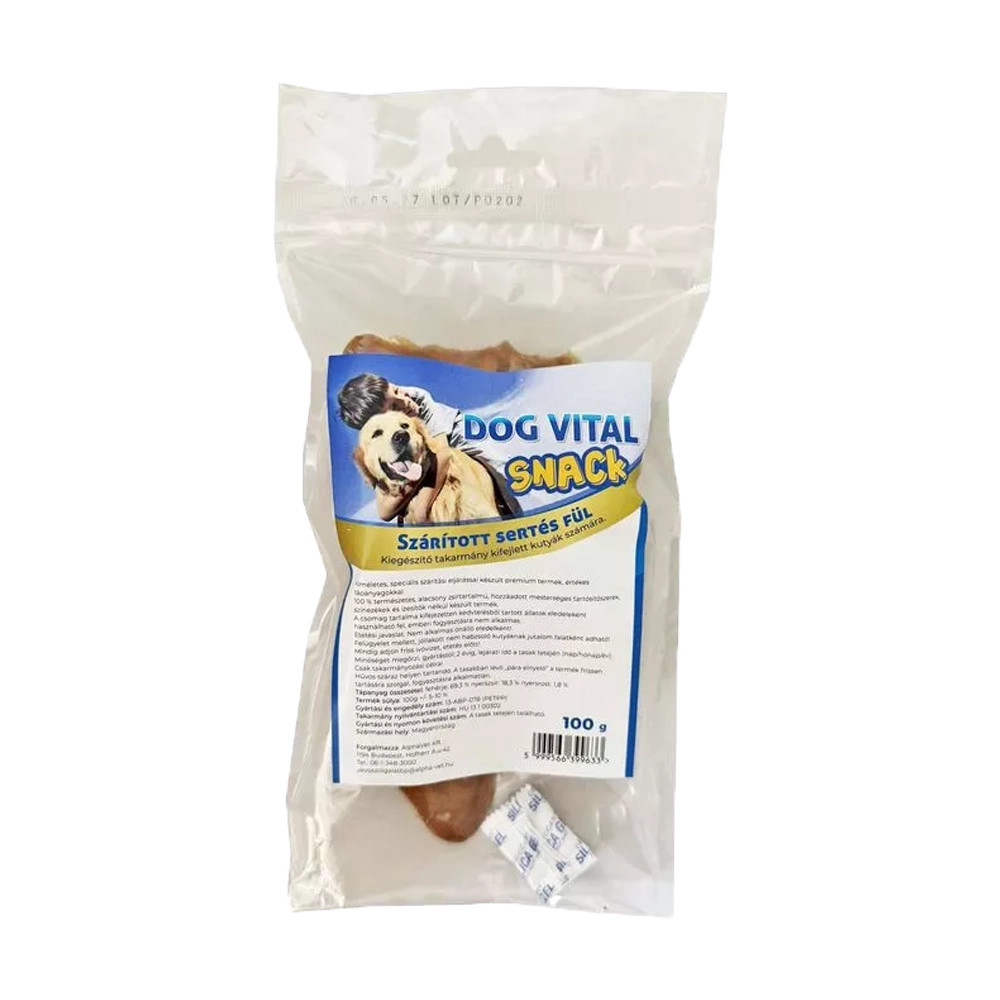 Dog Vital Snack Szárított Sertés Fül Monoprotein Gabonamentes Jutalomfalat Kutyáknak Kíméletes, speciális szárítási eljárással készült prémium termék, értékes tápanyagokkal. 100 % természetes, alacsony zsírtartalmú, hozzáadott mesterséges tartósítószerek, színezékek és ízesítők nélkül készült termék.Tápanyag összetétel: Fehérje:69,3 % nyerszsír:18,3 % nyersrost:1,8 %A csomag tartalma kifejezetten kedvtelésből tartott állatok eledeleként használható fel, emberi fogyasztásra nem alkalmas.