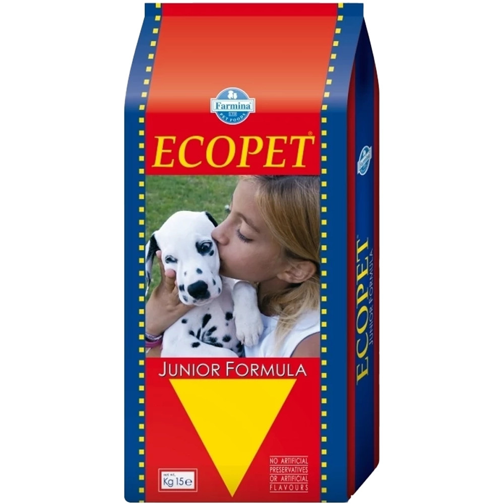 Ecopet Junior Száraz Kutyatáp (Csirke)Teljes értékű, kiegyensúlyozott eledel kölyökkutyák és vemhes vagy szoptató szukák számára. Az Ecopet Junior Formula teljes értékű eledel a leválasztás alatt álló kölyökkutyák és növendék kutyák, valamint a vemhes vagy szoptató szukák számára. Az Ecopet Junior Formula a lehető legjobb összetevőket tartalmazza, hogy kutyájának teljes értékű és kiegyensúlyozott étrendet nyújtson. Kiváló minőségű összetevői rendkívül étvágygerjesztővé és könnyen emészthetővé teszik ezt az eledelt.Összetevők:Dehidratált csirkehús, kukorica, búzaliszt, csirkezsír, rizs, szárított répapép, kukoricaglutén, kalcium-karbonát, nátrium-klorid, mono-dikalcium-foszfátAnalitikai összetevők:Nyers fehérje 27,00%; nyers zsír 14,00%; nyers rost 2,40%; nyers hamu 8,20%Táplálkozási adalékanyagok kilogrammonként:A-vitamin 12000IU; D3-vitamin 1200IU; E-vitamin 120mg; C-vitamin 120mg; niacin 30mg; pantoténsav 12mg; B2-vitamin 6mg; B6-vitamin 4,8mg; B1-vitamin 3,6mg; H-vitamin 0,30mg; folsav 0,36mg; B12-vitamin 0. 048mg; kolin-klorid 2400mg; cink-oxid 108mg; cink-szulfát monohidrát 120mg; mangán-szulfát monohidrát 150mg; vas-szulfát monohidrát 44mg; vas-karbonát 60mg; réz-szulfát pentahidrát 50mg; kalcium-jodát vízmentes 2,4mg; nátrium-szelenit 0,22mg; DL-metionin 2400mg