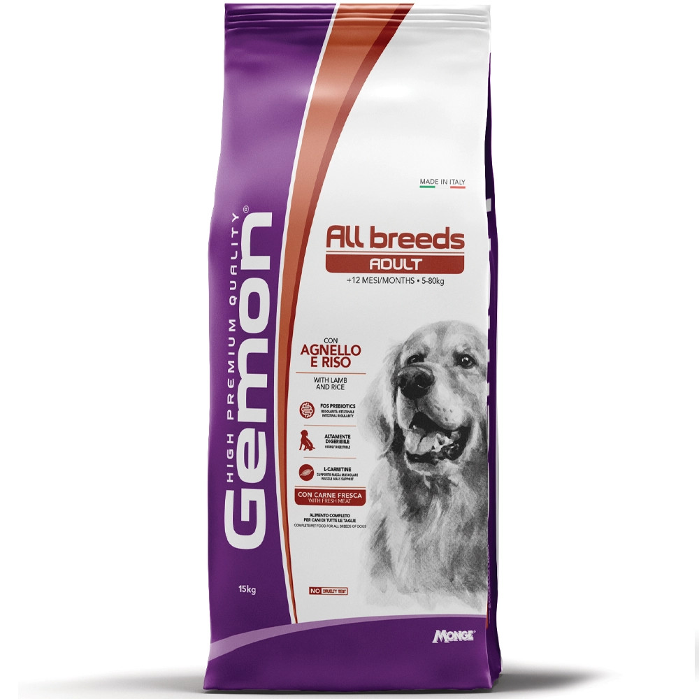 A Gemon Dog All Breeds Adult Lamb & Rice egy teljes értékű eledel minden méretű felnőtt kutya számára. A készítményt olyan kiváló minőségű összetevők jellemzik, mint a bárányhús, amely az alapvető tápanyagok forrása, és a rizs, amely szénhidrátforrás. A receptúra az extrudálási eljárásnak köszönhetően rendkívül emészthető. Az optimális ízletesség érdekében friss húst és az izomtömeg támogatására L-karnitint tartalmaz.