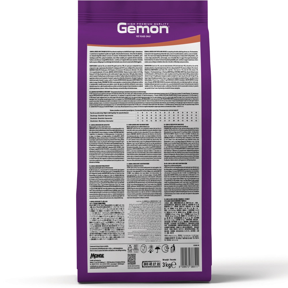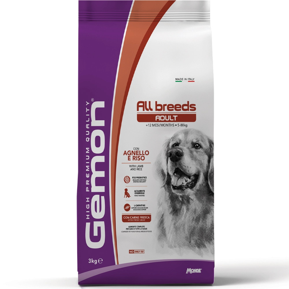 A Gemon Dog All Breeds Adult Lamb & Rice egy teljes értékű eledel minden méretű felnőtt kutya számára. A készítményt olyan kiváló minőségű összetevők jellemzik, mint a bárányhús, amely az alapvető tápanyagok forrása, és a rizs, amely szénhidrátforrás. A receptúra az extrudálási eljárásnak köszönhetően rendkívül emészthető. Az optimális ízletesség érdekében friss húst és az izomtömeg támogatására L-karnitint tartalmaz.
