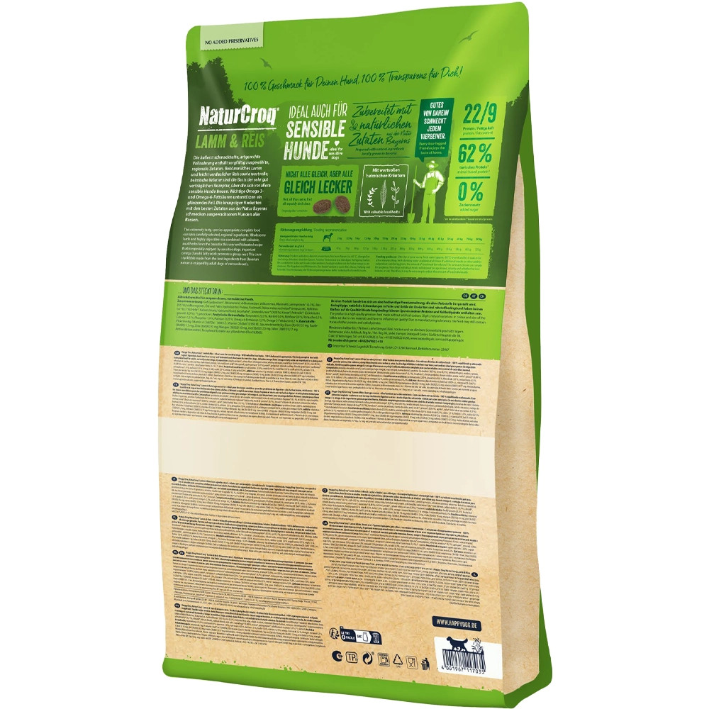 Happy Dog NaturCroq Száraz Kutyatáp (Bárány és Rizs)• Főként regionális alapanyagok• Könnyen emészthető• Kiegyensúlyozott fehérje-válogatás• Gyomor- és bélbarátKönnyen emészthető természetes eledel báránnyal és rizzsel, felnőtt kutyáknakÉrzékeny a kutyád gyomor- és bélrendszere? Akkor imádni fogja a Happy Dog NaturCroq Lamm & Reis-t, az egészséges teljes értékű eledelt a legjobb bajor alapanyagokból. Az ízletes, kemény tápszemek kizárólag kiváló minőségű alapanyagokat tartalmaznak, például könnyen emészthető bárányhúst, nagyon jól emészthető rizst és egészséges, a régióból származó teljes kiőrlésű gabonát. A bárány kiváló minőségű állati fehérjét biztosít kedvencednek, a rizs pedig nagyon jó gyomor- és bélbarát szénhidrátforrás. A teljes kiőrlésű gabonából készült termékek fontos élelmi rostokat biztosítanak. Ezenkívül szabályozzák a bélműködést, telítenek és elősegítik az emésztést. Ezáltal támogathatják a bélrendszer egészségét. Számos B-vitamint, ásványi anyagot, például magnéziumot, vasat, szelént és cinket is tartalmaznak, és tele vannak összetett szénhidrátokkal. Az ízletes receptet értékes bajor gyógynövényekkel egészítettük ki, amelyek természetes módon számos értékes tápanyaggal látják el négylábú kedvenced. Ez a kiegyensúlyozott szárazeledel ideális minden fajta felnőtt, normál aktivitású, gyomor- és bélrendszeri érzékenységre hajlamos kutya számára, mivel a bárányhús és rizs etetése sikeresnek bizonyult az ilyen kutyák esetében.Összetétel:Baromfifehérje*, búzaliszt, teljes kiőrlésű búza, teljes kiőrlésű kukorica, kukoricaliszt, bárányfehérje* (8,5 %), rizs (8,5 %), teljes kiőrlésű árpa, olajok és zsírok, hidrolizált fehérje, halliszt, melaszos cukorrépaszelet* (cukormentesített), almatörköly* (0,7 %), élesztő*, kálium-klorid, nátrium-klorid, zöld zab*, napraforgó* (0,08 %), zsázsa*, petrezselyem*, (zöldfűszerek összesen: 0,3 %)*szárítottAnalitikai összetevők:Nyersfehérje 22,0 %, nyerszsír 9,0 %, nyersrost 3,0 %, nyershamu 6,5 %, kalcium 1,5 %, foszfor 1,0 %, nátrium 0,25 %, omega-6 zsírsavak 2,2 %, omega-3 zsírsavak 0,2 %Adalékanyagok:Vitaminok / kg:A-vitamin (3a672a) 15000 NE, D3-vitamin (3a671) 950 NENyomelemek / kg:vas (3b103) 55 mg, réz (3b405) 12 mg, cink (3b603) 95 mg, mangán (3b502) 10 mg, jód (3b202) 2,5 mg, szelén (3b801) 0,17 mgAntioxidáns:növényi olajokból származó tokoferol-kivonatok 1b306(i)