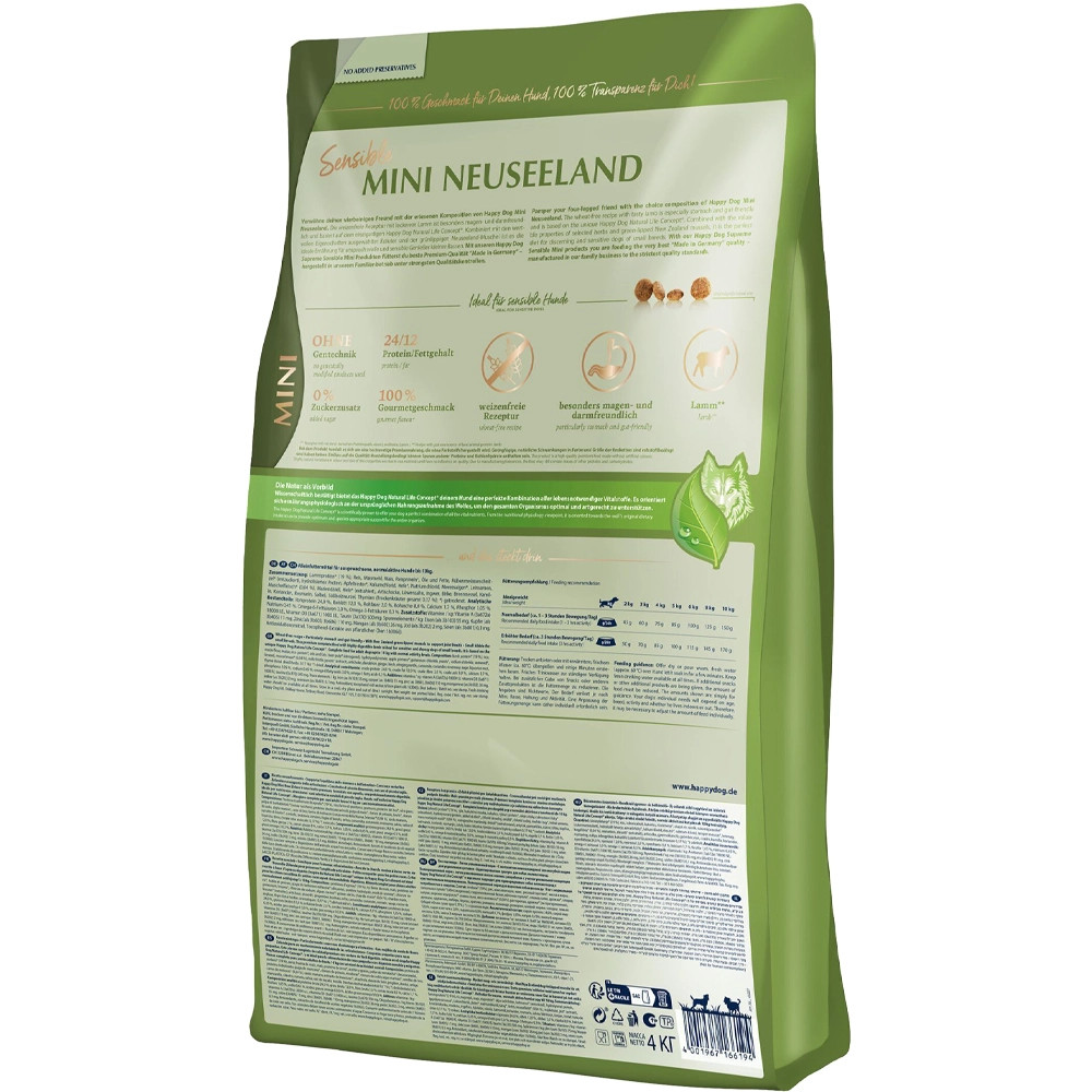 Happy Dog Sensible Neuseeland Mini Hipoallergén Száraz Kutyatáp (Bárány)• Bárány• Könnyen emészthető• Gluténmentes recept• Kíméletes a gyomorhoz és a belekhezKülönösen gyomor- és bélbarát kutyatáp, válogatott bárányhússalEtesse négylábú barátját a Happy Dog Sensible Mini Neuseeland emészthető szárazeledellel: igazi csemege, amely a könnyen emészthető bárányhúsnak és a gluténmentes receptúrának köszönhetően különösen gyomor- és bélbarát. A gondosan válogatott, teljesen természetes összetevőknek köszönhetően a kutyatáp rendkívül ízletes és könnyen emészthető a kistestű kutyák számára. A krokett mérete is kifejezetten a kistestű kutyák fogaihoz van igazítva.Optimális tápanyagkeverék természetes összetevőkbőlA Happy Dog táplálkozási koncepciója a létfontosságú tápanyagok és természetes összetevők ésszerű kombinációját biztosítja a Happy Dog Sensible Mini Neuseeland és az összes többi Sensible kutyatáp esetében. A benne található zöld ajkú új-zélandi kagyló támogatja a kiskutya ízületeit, az omega-3 és omega-6 zsírsavak pedig jót tesznek az ép szőrzetnek. Mindezek alapján ízletes, szuperprémium, teljes értékű eledelünk ideális az igényes kistestű kutyák számára 10 kg-ig.Rágcsálnivalóként vagy nedves eledelként is kaphatóSzeretné, ha a kiskutyája a száraztáp mellett nedves eledelt és rágcsálnivalót is kapna? Nem probléma, mert a Sensible Neuseeland könnyen emészthető húsos eledelként is kapható, 100%-ban bárányból származó állati fehérjével, például 200 g-os konzervdobozban. Edzéshez vagy rágcsálnivalóként a Happy Dog Soft Snack Mini Neuseeland is megtalálható a kínálatunkban. Engedje, hogy kis kedvence megkóstolja a gluténmentes, édes szív alakú jutalomfalatokat.Összetétel:Bárányfehérje* (19 %), rizs, kukoricaliszt, kukorica, rizsfehérje*, olajok és zsírok, cukorrépa-melaszpép* (cukortalanított), hidrolizált fehérje, almapogácsa*, kálium-klorid, élesztő*, nátrium-klorid, tengeri moszat*, lenmag, kagylóhús* (0,04 %), máriatövis, élesztő* (extrahálva), articsóka, gyermekláncfű, gyömbér, nyírfa, csalán, kamilla, koriander, rozmaring, zsálya, édesgyökér, kakukkfű (szárított gyógynövények összesen 0,17 %)*szárítottAnalitikai összetevők:Nyersfehérje 24,0 %, nyerszsír 12,0 %, nyersrost 2,0 %, nyershamu 8,0 %, kalcium 1,7 %, foszfor 1,05 %, nátrium 0,45 %, omega-6 zsírsavak 3,0 %, omega-3 zsírsavak 0,3 %Adalékanyagok:Vitaminok/kg:D3-vitamin (3a671) 1000 NE, taurin (3a370) 500 mgNyomelemek/kg:(mint 3b103) 55 mg, réz (mint 3b405) 11 mg, cink (mint 3b603, 3b606) 110 mg, mangán (mint 3b502) 26 mg, jód (mint 3b202) 2 mg, szelén (mint 3b801) 0,1 mgAntioxidáns:tokoferol kivonatok növényi olajokból 1b306(i)