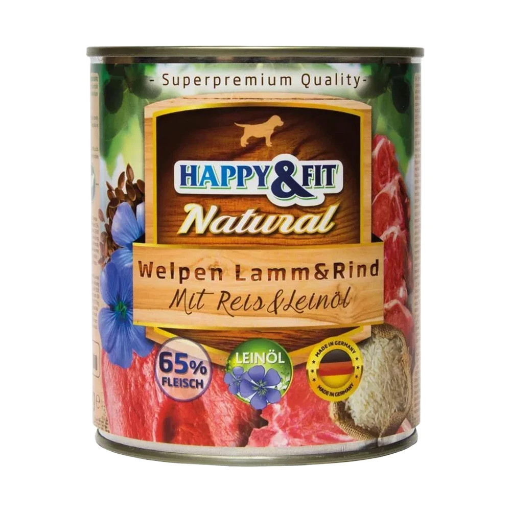 Happy&Fit Natural Dog konzerv kölyökkutyáknak bárányhússal, marhahússal, rizzsel és lenmagolajjal.