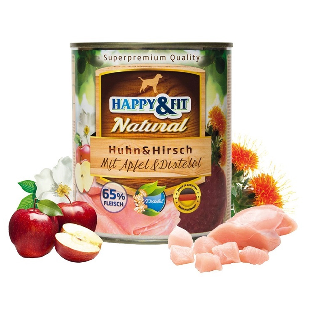 A Happy&Fit Natural Dog Konzerv kiváló választás minden kutyatulajdonos számára, aki prémium minőségű, természetes alapanyagokból készült nedves tápot keres kedvence számára. A csirke és szarvas húsának ínycsiklandó kombinációja almával és sáfrányolajjal gazdagítva, tökéletes tápanyagforrást biztosít minden életkorú kutya számára. Ez a különleges receptúra nem csak ízletes, de az egészséges fejlődéshez szükséges vitaminokat és ásványi anyagokat is tartalmazza.