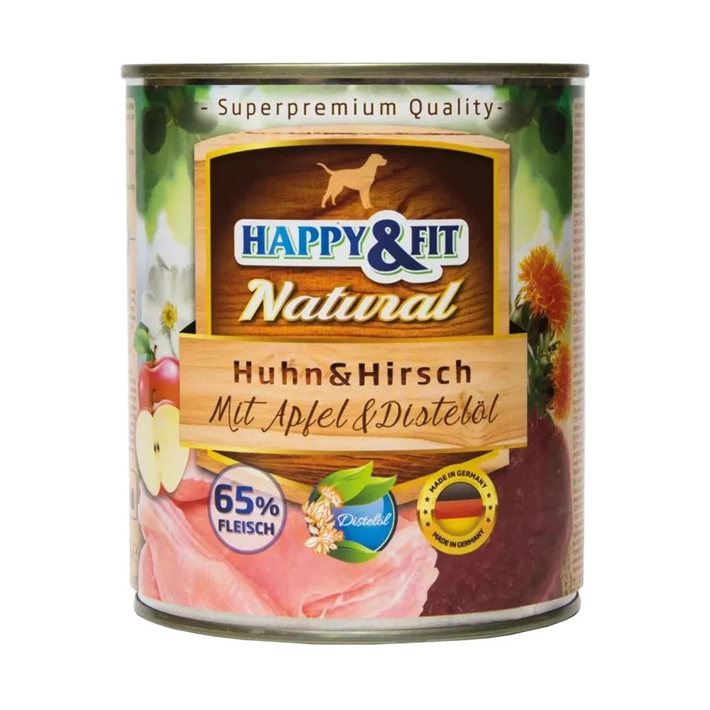 Happy&Fit Natural Konzerv Kutyáknak (Csirke, Szarvas, Alma és Sáfrányolaj)• Magas hústartalommal• Ízletes, jó minőségű csirkehússal és szarvashússal, almával• Sáfrányos szeklice olajjal, amely többszörösen telítetlen zsírsavakat tartalmaz, jó hatással van a bőrre és méregtelenít• Német minőségHappy&Fit Natural Dog konzerv felnőtt kutyáknak csirkehússal, szarvashússal, almával és sáfrányos szekliceolajjal.A Happy&Fit Natural Dog Konzerv kiváló választás minden kutyatulajdonos számára, aki prémium minőségű, természetes alapanyagokból készült nedves tápot keres kedvence számára. A csirke és szarvas húsának ínycsiklandó kombinációja almával és sáfrányolajjal gazdagítva, tökéletes tápanyagforrást biztosít minden életkorú kutya számára. Ez a különleges receptúra nem csak ízletes, de az egészséges fejlődéshez szükséges vitaminokat és ásványi anyagokat is tartalmazza.Ízesítés: Csirkehús és Szarvashús: Kiváló minőségű fehérjeforrások, amelyek támogatják az izomzat fejlődését és fenntartásátAlma: Gazdag rostokban és antioxidánsokban, elősegíti az emésztést és támogatja az immunrendszertSáfrányolaj: Omega-6 zsírsavakban gazdag, javítja a bőr és a szőrzet egészségét, valamint gyulladáscsökkentő hatásúElőnyök: Természetes Összetevők: Mesterséges színezékek és tartósítószerek nélkül, a természetes táplálkozás érdekébenTeljes Értékű Táplálék: Minden szükséges tápanyagot tartalmaz, hogy kutyája egészséges és boldog legyenÍzletes és Tápláló: A csirke és szarvas kombinációja almával kiegészítve különleges ízélményt nyújt, amelyet kutyája imádni fogNémet minőség: Szakértők által kifejlesztett, szigorú minőségi kontroll alattÖsszetétel: Hús és állati eredetű származékok 65% (ebből 15% csirke, 15% szarvas), gyümölcsök (alma 5%), ásványi anyagok 1%, olajok és zsírok (0,1% sáfrányos szeklice olaj)Analitikai összetevők: Nyersfehérje 10,7%, nyerszsír 6,4%, nyershamu 2,5%, nyersrost 0,4%, nedvesség 75,0%Tápértékkel rendelkező adalékanyagok/kg: D3-vitamin (E671) 200 NE, E-vitamin (alfa-tokoferolacetát) 30 NE, C-vitamin (E300) 40mg, B1-vitamin 13mg, B2-vitamin 6mg, B6-vitamin 3mg, B12-vitamin 75 μg, niacinamid 17mg, Ca-pantotenát 12mg, folsav 0,6mg, biotin 300 μg, kolin-klorid 700mg, cink (cink-szulfát, monohidrát) 15mg, magán (mangán-II-szulfát, monohirdát) 3mg, jód (kalcium-jodát, vízmentes) 0,75mg