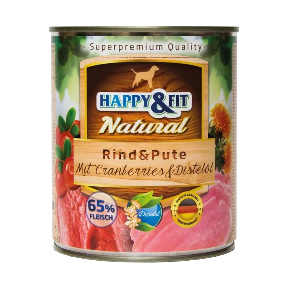 Happy&Fit Natural Konzerv Kutyáknak (Marha, Pulyka, Áfonya és Sáfrányolaj)• Magas hústartalommal• Ízletes, jó minőségű marhahússal és pulykahússal, vörösáfonyával• Sáfrányos szeklice olajjal, amely többszörösen telítetlen zsírsavakat tartalmaz, jó hatással van a bőrre és méregtelenít• Német minőségHappy&Fit Natural felnőtt kutyáknak marhahússal, pulykahússal, vörösáfonyával, sáfrányos szekliceolajjal.Ismerd meg a Happy&Fit Natural Dog Konzervet, amely kiváló minőségű marha- és pulykahúsból készült, áfonyával és sáfrányolajjal kiegészítve. Ez a prémium nedves táp minden kutya számára ideális választás, hiszen természetes összetevői és kiegyensúlyozott receptúrája biztosítja a kutya egészséges és boldog életét. Az ízletes kombináció és a tápanyagban gazdag formula garantálja, hogy kutyája minden étkezést élvezni fog.Ízesítés: Marhahús és Pulykahús: Magas fehérjetartalmú alapanyagok, amelyek támogatják az izomzat fejlődését és fenntartását.Áfonya: Antioxidánsokban gazdag, elősegíti az immunrendszer működését és támogatja az általános egészséget.Sáfrányolaj: Omega-6 zsírsavakban gazdag, elősegíti a bőr és a szőrzet egészségét, valamint gyulladáscsökkentő hatású. Előnyök: Természetes Összetevők: Mentes minden mesterséges színezéktől és tartósítószertől, így biztos lehet benne, hogy kutyája a legtermészetesebb táplálékot kapja.Teljes Értékű Táplálék: Minden szükséges vitamint és ásványi anyagot tartalmaz, amelyek hozzájárulnak kutyája kiegyensúlyozott étrendjéhez.Ízletes és Tápláló: A marha és pulyka ízletes kombinációja áfonyával különleges ízélményt nyújt, amit kutyája imádni fog.Német minőség: Szakértők által kifejlesztett, szigorú minőségi kontroll alatt Miért válassza a Happy&Fit Natural Dog Konzervet? A Happy&Fit Natural Dog Konzerv tökéletes választás minden kutyatartó számára, aki prémium minőségű, természetes alapanyagokból készült táplálékot keres kedvencének. A gondosan válogatott összetevők és a tápanyagban gazdag receptúra biztosítja, hogy kutyája minden szükséges tápanyagot megkapjon, amire szüksége van az egészséges és boldog élethez.Összetétel: Hús és állati eredetű származékok 65% (ebből 15% marha, 15% pulyka), gyümölcsök (5% vörösáfonya), ásványi anyagok 1%, olajok és zsírok (0,1% sáfrányos szeklice olaj)Analitikai összetevők: Nyersfehérje 10,6%, nyerszsír 6,3%, nyershamu 2,3%, nyersrost 0,4%, nedvesség 75,0%Tápértékkel rendelkező adalékanyagok/kg: D3-vitamin (E671) 200 NE, E-vitamin (alfa-tokoferolacetát) 30 NE, C-vitamin (E300) 40mg, B1-vitamin 13mg, B2-vitamin 6mg, B6-vitamin 3mg, B12-vitamin 75 μg, niacinamid 17mg, Ca-pantotenát 12mg, folsav 0,6mg, biotin 300 μg, kolin-klorid 700mg, cink (cink-szulfát, monohidrát) 15mg, magán (mangán-II-szulfát, monohirdát) 3mg, jód (kalcium-jodát, vízmentes) 0,75mg
