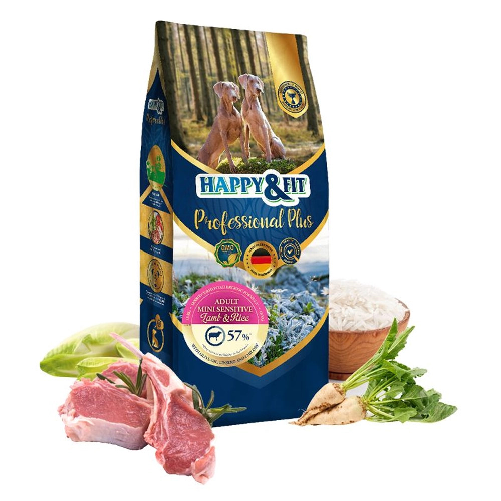 Ha szeretnéd biztosítani felnőtt, érzékeny gyomrú kis termetű kutyád számára a legjobb táplálékot, a Happy&Fit Professional Plus Adult Mini Sensitive Lamb & Rice száraz kutyatáp ideális választás. Ez a prémium minőségű eledel kifejezetten a kis termetű kutyák speciális igényeire lett kifejlesztve, hipoallergén összetevőkkel, hogy kutyád egészséges, boldog és energikus maradjon. Ez az ízletes táp bárányhúsban gazdag, mely egy könnyen emészthető fehérjeforrás.