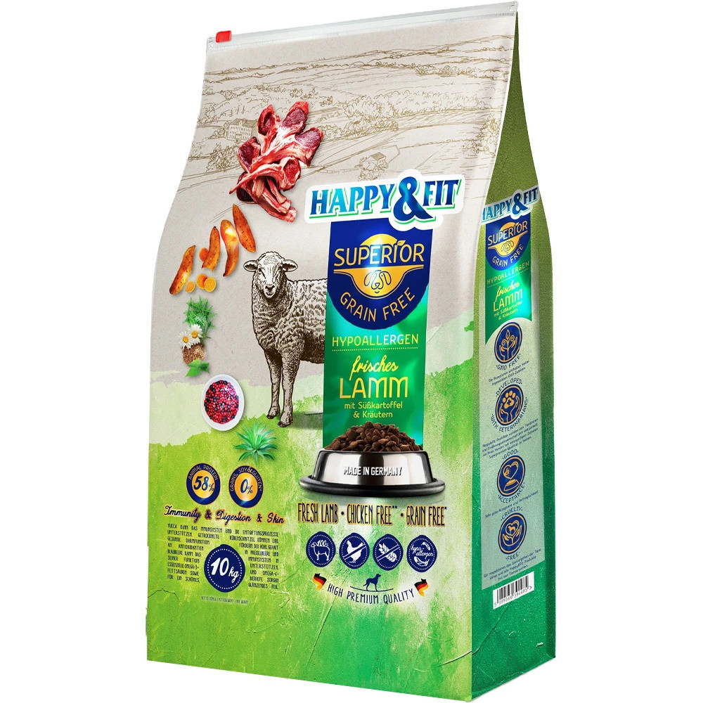 Happy&Fit Superior Gabonamentes Hipoallergén Száraz Kutyatáp (Friss Bárány, Édesburgonya és Gyógynövények)A Happy&Fit állatorvosokból és táplálkozási szakértőkből álló csapatánál úgy gondoljuk, hogy négylábú családtagjaink tálkájába csak kiváló minőségű összetevőkből készült eledel kerülhet. Ha ön is így gondolja, bátran válasszon a Happy&Fit Superior tápok közül! Lankás, dimbes-dombos völgyek, napsütötte tájak – innen származnak a Happy&Fit tápok válogatott összetevői. Bárány az első számú összetevő, amely Új-Zélandról származik. Ha kutyája válogatós vagy érzékeny emésztőrendszerrel rendelkezik, bátran ajánljuk ezt a könnyen emészthető eledelt számára!Friss bárányhúsból készült, így a táp emészthetőbb és ízletesebb. A tápban található édesburgonya magas antioxidáns tartalmú és rostokban gazdag. A tápban található gyógynövény keverék segítheti az immunrendszer támogatását. A yukka támogathatja az immunrendszert és a méregtelenítési folyamatokat. A szárított sárgarépapép segítheti a bélműködést. A vörösáfonya és a kékáfonya magas antioxidáns tartalma révén, segítheti az immunrendszer működését. A tápanyagban gazdag formula frukto-oligoszacharidokkal és prebiotikumokkal (például cikória) segítheti az emésztőrendszer működését. OMEGA-3 és OMEGA-6 zsírsavakat, valamint szárított sörélesztőt is tartalmaz, amelyek segíthetik a fényes szőrzet kialakulását.Szabad tartású állatokból. A bárány szabadon tartott jószágokból származik, amelyek húsa kiváló minőségű. Kíméletes gyártási eljárással készült, így a tápban található természetes tápanyagok és vitaminok megmaradnak, mely igazán ízletes és természetes ízt eredményez. A Happy&Fit Superior termékek receptúrái nem tartalmaznak hozzáadott mesterséges ízfokozókat, gabonát, szóját és tartósítószereket. Az összetevők többsége ellenőrzött gazdálkodásból származik. Az összetevők beszerzési útvonala szigorúan ellenőrzött. A gyártási folyamatot német szakemberek végzik. A Happy&Fit Superior tápok gyártási folyamatai megfelelnek az IFS szabványoknak. Az IFS egy olyan magas szintű ellenőrzési szabvány, amely többek között az állateledel gyártó üzemeket is minősíti. A bárány – mint első számú fehérjeforrás mellett – csak hidrolizált állati fehérjét tartalmaz.Ha ön is így gondolja, bátran válasszon a Happy&Fit Superior tápok közül!Összetétel: Bárány (fagyasztva) 20%, burgonyaliszt, bárányfehérje (szárítva) 17,5%, burgonyapehely, borsó (szárítva), édesburgonya (6%), szárított répapép, baromfizsír, tápióka (szárított), burgonyafehérje, hidrolizált fehérje , gyógynövények 0,2% (szárított, csalán, szeder levél, cickafark, édeskömény, kömény, kamillavirág, fagyöngy, tárnics gyökér, ezerjófű, paradicsompaszta (szárított), vörösáfonya (szárított, 0,15%), áfonya (szárítva, 0,15%), élesztők (szárítva), cikória (szárítva), yukka (szárítva, 0,006%)Analitikai összetevők: Fehérje: 23,0%, Zsírtartalom: 13,0%, Nyersrost: 3,0%, Nyershamu: 7,4%, Omega-3 zsírsavak: 0,15%, Omega-6 zsírsavak: 1,25%, Kalcium: 1,80%, Foszfor: 1,15%Tápértékkel rendelkező adalékanyagok/kg: A-vitamin: 12 000 NE, D3-vitamin: 1 200 NE, E-vitamin (mint minden rac-α-tokoferil-acetát): 100 mg, Réz (réz-szulfát, pentahidrát formájában): 10 mg, Cink (cink-oxid formájában): 70 mg, Cink (aminosavak cinkkelátjaként hidrát formájában): 6 mg, Jód (kalcium-jodát, vízmentes): 2 mg, Szelén (nátrium-szelenit formájában): 0,2 mg, Taurin: 300 mgTechnológiai adalékanyagok: Antioxidánsok