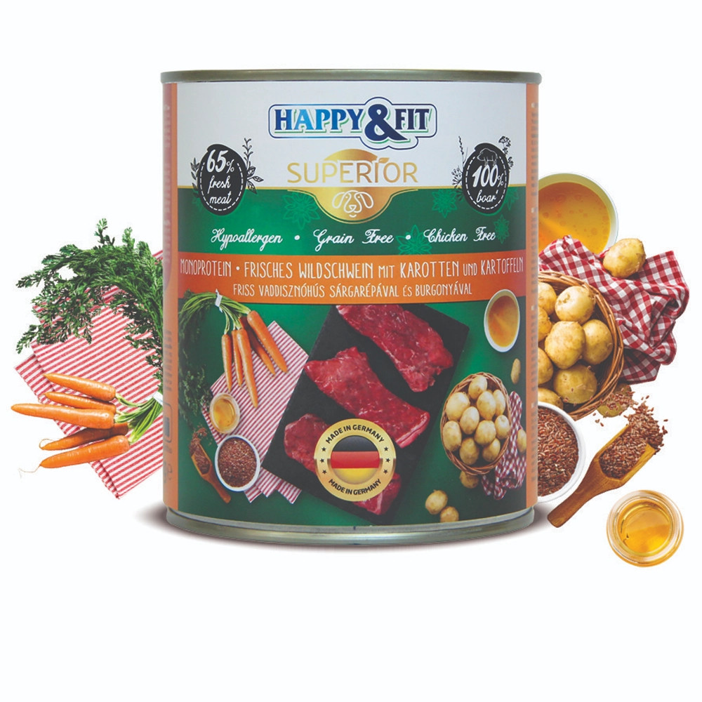 Happy&Fit Superior Konzerv Kutyáknak (Friss Vaddisznó, Sárgarépa és Burgonya)• 65% friss vaddisznóhúst tartalmaz!• A sárgarépa és a burgonya magas rosttartalommal rendelkezik, megkönnyítve az emésztést• A lenmag olaj segítheti a fényes szőrzet és egészséges bőr fenntartását• 100% Monoprotein: Az állati eredetű fehérje forrása kizárólag vaddisznóból származik.• Nem tartalmaz csirke- vagy baromfihúst- és gabonaféléket• Nem tartalmaz hozzáadott mesterséges aromákat, búzaglutént, szóját, mesterséges ízfokozókat vagy tartósítószereket• Német minőségA Happy&Fit Superior Dog Konzerv friss vaddisznóhússal, sárgarépával és burgonyával készült, hogy kutyája számára ízletes és tápanyagban gazdag étkezést biztosítson. Ez a prémium minőségű nedvestáp ideális választás minden életkorú és fajtájú kutya számára. A természetes összetevők és a kiegyensúlyozott receptúra garantálja, hogy kedvence minden szükséges tápanyagot megkapjon az egészséges és boldog élethez.Happy&Fit Superior Konzerv felnőtt, érzékeny emésztésű, táplálékallergiára hajlamos, válogatós kutyáknak ajánljuk.Ízesítés: Friss Vaddisznóhús: Magas fehérjetartalmú, kiváló minőségű húsforrás, amely támogatja az izomzat fejlődését és fenntartását.Sárgarépa: Vitaminokban gazdag zöldség, amely antioxidánsokkal és rostokkal segíti az immunrendszert és az emésztést.Burgonya: Könnyen emészthető szénhidrátforrás, amely energiát biztosít a kutya számára és támogatja az emésztőrendszer egészségét.Előnyök: Természetes Összetevők: Mentes minden mesterséges színezéktől és tartósítószertől, így biztos lehet benne, hogy kutyája a lehető legtermészetesebb táplálékot kapja.Teljes Értékű Táplálék: Tartalmazza az összes szükséges vitamint és ásványi anyagot, amelyek hozzájárulnak kutyája kiegyensúlyozott étrendjéhez.Ízletes és Tápláló: A friss vaddisznóhús, sárgarépa és burgonya ízletes kombinációja különleges ízélményt nyújt, amit kutyája imádni fog.Német minőség: Szakértők által kifejlesztett, szigorú minőségi kontroll alatt Miért válassza a Happy&Fit Superior Dog Konzervet? A Happy&Fit Superior Dog Konzerv tökéletes választás minden gondoskodó gazdi számára, aki szeretné biztosítani kutyájának a legjobb minőségű táplálékot. A gondosan válogatott, természetes összetevők és a tápanyagokban gazdag receptúra biztosítja, hogy kutyája egészséges, boldog és energikus legyen.Összetétel: 65% vaddisznó hús és vaddisznó belsőség, 28,9% vaddisznó hús alaplé, 3% sárgarépa, 2% burgonya, 1% ásványi anyagok, 0,1% lenmagolajAnalitikai összetevők: Nyersfehérje: 10,50%; Nyers zsír: 6,50%; Nyers hamu: 2,30%; Nyersrost: 0,40%; Nedvességtartalom: 76,00%; Omega-3 zsírsavak: 0,20%; Omega-6 zsírsavak: 0,80%Tápértékkel rendelkező adalékanyagok/ kg: D3-vitamin (E671): 200 NE. ; E-vitamin (alfa-tokoferolacetat): 20 NE.; B1-vitamin: 10 mg; B2-vitamin: 6 mg; B6-vitamin: 2 mg; B12-vitamin: 75 mcg; Nikotinamid: 15 mg; Ca-pantotenát: 9 mg; Folsav: 0,35 mg; Biotin: 300 mcg; Kolin-klorid: 1200 mg; Cink (cink-szulfát, monohidrát): 25 mg; Mangán (mangan-II-szulfat, monohidrát) (E5): 1,4 mg; Jód kalcium-jodát, vízmentes: 0,75 mg