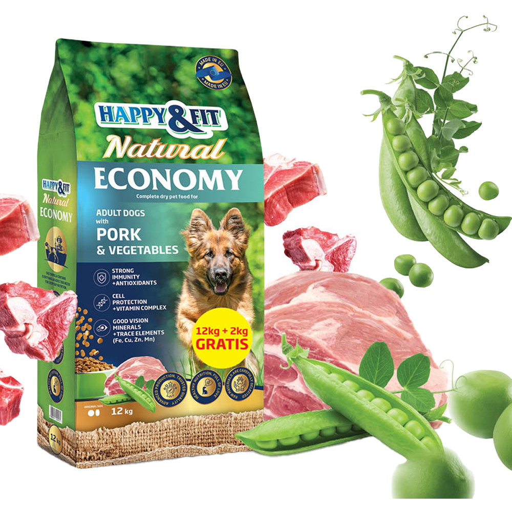 A Happy&Fit Economy Adult Sertéshússal és Zöldségekkel teljesértékű szárazeledel felnőtt kutyák részére, amely ideális választás a mindennapi tápláláshoz. A receptúra szárított sertéshúst tartalmaz, amelyek magas biológiai értékű fehérjével látják el kedvencedet. A hozzáadott zöldségek természetes rost- és tápanyagforrásként segítik az emésztést és a jó közérzet fenntartását.