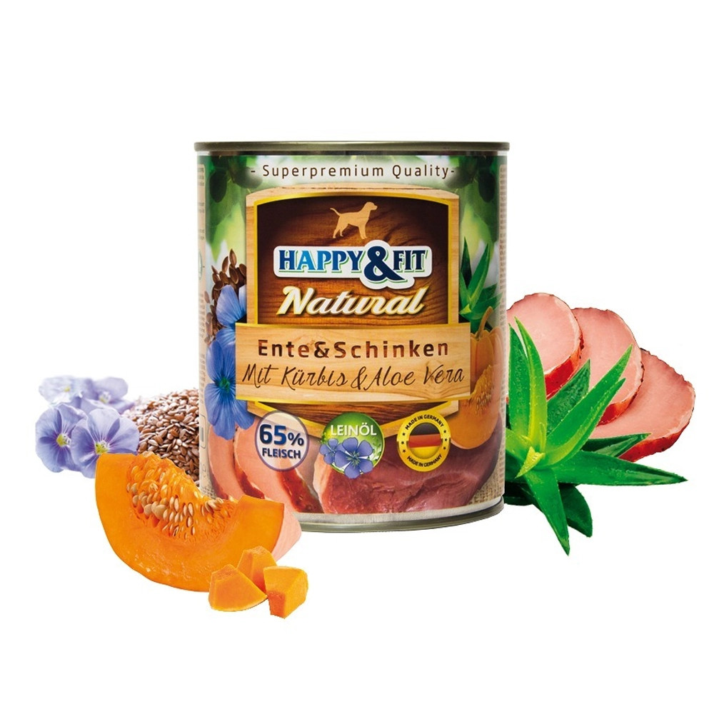 Happy&Fit Natural Konzerv Kutyáknak (Kacsa, Sonka, Sütőtök és Aloe vera) • Magas hústartalommal• Ízletes, jó minőségű kacsahússal és sonkával, sütőtökkel• Aloe Verával, mely erősíti az immunrendszert és számos kedvező egészségügyi hatással rendelkezik• Lenmagolajjal, amely telítetlen zsírsavakat és nagy mennyiségű Omega-3 és Omega-6 zsírsavakat tartalmaz és kedvező hatással van a bőrreHappy&Fit Natural Dog konzerv felnőtt kutyáknak kacsahússal, sonkával, sütőtökkel és aloe verával.Fedezze fel a Happy&Fit Natural Dog Konzervet, amely kacsa és sonka ízletes kombinációjával készült, és sütőtökkel, valamint aloe verával gazdagított. Ez a prémium minőségű nedvestáp minden kutya kedvence lesz, hiszen természetes összetevői és kiegyensúlyozott receptúrája támogatja kedvence egészségét és jólétét.Ízesítés: Kacsa és Sonka: Magas biológiai értékű fehérjeforrások, amelyek hozzájárulnak az izomzat építéséhez és a vitalitás fenntartásához.Sütőtök: Gazdag rostokban és antioxidánsokban, támogatja az emésztőrendszert és az immunrendszert.Aloe Vera: Ismert gyulladáscsökkentő és bőrápoló hatásáról, elősegíti az általános egészséget és a bőr regenerálódását.Előnyök: Természetes Összetevők: Mentes minden mesterséges adalékanyagtól, színezéktől és tartósítószertől, így biztos lehet benne, hogy kutyája a legjobbat kapja.Tápláló és Finom: A gondosan válogatott alapanyagok kombinációja olyan ízvilágot kínál, amit kutyája imádni fog, miközben minden szükséges tápanyagot biztosít számára.Egészséges Étrend: Támogatja a kutya emésztését, bőrének és szőrzetének egészségét, valamint az immunrendszer működését.Német minőség: Német szakértelemmel, szigorú minőségi kontroll alatt készülÖsszetétel: Hús és állati eredetű származékok 65% (ebből 20% kacsa, 10% sonka), zöldségek (3% sütőtök), növényi eredetű származékok (2% Aloe Vera), ásványi anyagok 1%, olajok és zsírok (0,1% lenmagolaj)Analitikai összetevők: Nyersfehérje 10,6%, nyerszsír 6,6%, nyershamu 2,4%, nyersrost 0,4%, nedvesség 75,0%Tápértékkel rendelkező adalékanyagok/kg: D3-vitamin (E671) 200 NE, E-vitamin (alfa-tokoferolacetát) 30 NE, C-vitamin (E300) 40mg, B1-vitamin 13mg, B2-vitamin 6mg, B6-vitamin 3mg, B12-vitamin 75 μg, niacinamid 17mg, Ca-pantotenát 12mg, folsav 0,6mg, biotin 300 μg, kolin-klorid 700mg, cink (cink-szulfát, monohidrát) 15mg, magán (mangán-II-szulfát, monohirdát) 3mg, jód (kalcium-jodát, vízmentes) 0,75mg