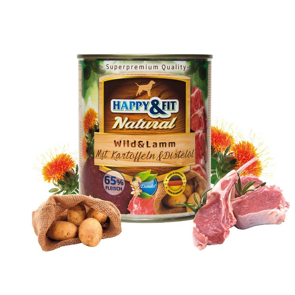 Happy&Fit Natural Konzerv Kutyáknak (Vad, Bárány, Burgonya és Sáfrányolaj) • Magas hústartalommal• Ízletes, jó minőségű vadhússal és bárányhússal, burgonyával• Sáfrányos szeklice olajjal, amely többszörösen telítetlen zsírsavakat tartalmaz, jó hatással van a bőrre és méregtelenít• Német minőség• Ízfokozóktól és tartósítószerektől mentesHappy&Fit Natural Dog Konzerv felnőtt kutyáknak vadhúsokkal, bárányhússal, burgonyával és sáfrányos szekliceolajjal.A Happy&Fit Natural Dog Konzerv vadhús és bárány kombinációjával, burgonyával és sáfrányolajjal gazdagítva tökéletes választás, ha kutyája számára prémium minőségű és természetes alapanyagokból készült nedvestápot keres. Ez az ínycsiklandó receptúra nemcsak ízletes, hanem minden szükséges tápanyagot biztosít kedvence egészségének és vitalitásának fenntartásához.Ízesítés: Vadhús és Bárányhús: Kiváló minőségű, magas fehérjetartalmú húsok, amelyek segítik az izomzat építését és erősítik az immunrendszert.Burgonya: Könnyen emészthető szénhidrátforrás, amely energiát biztosít a kutya számára, és támogatja az emésztőrendszer egészségét.Sáfrányolaj: Gazdag omega-6 zsírsavakban, amelyek elősegítik a bőr és a szőrzet egészségét, valamint gyulladáscsökkentő hatással bírnak.Előnyök: Természetes Összetevők: Mentes minden mesterséges színezéktől és tartósítószertől, hogy kutyája a lehető legtermészetesebb táplálékot kapja.Teljes Értékű Táplálék: Tartalmazza az összes szükséges vitamint és ásványi anyagot, amelyek hozzájárulnak a kutya kiegyensúlyozott étrendjéhez.Ízletes és Tápláló: A vadhús és bárány ízletes kombinációja burgonyával különleges ízélményt nyújt, amit kutyája imádni fog.Miért válassza a Happy&Fit Natural Dog Konzervet? A Happy&Fit Natural Dog Konzerv ideális választás minden gondoskodó gazdi számára, aki szeretné biztosítani kutyájának a legjobb táplálékot. A gondosan válogatott, természetes összetevők és a prémium minőség garantálja, hogy kutyája egészséges, boldog és energikus legyen.Összetétel: Hús és állati eredetű származékok 65% (ebből 15% vad, 15% bárány), zöldség (burgonya 5%), ásványi anyagok 1%, olajok és zsírok (0,1% sáfrányos szeklice olaj)Analitikai összetevők: Nyersfehérje 10,4%, nyerszsír 6,8%, nyershamu 2,3%, nyersrost 0,5%, nedvesség 75,0%Tápértékkel rendelkező adalékanyagok/kg: D3-vitamin (E671) 200 NE, E-vitamin (alfa-tokoferolacetát) 30 NE, C-vitamin (E300) 40mg, B1-vitamin 13mg, B2-vitamin 6mg, B6-vitamin 3mg, B12-vitamin 75 μg, niacinamid 17mg, Ca-pantotenát 12mg, folsav 0,6mg, biotin 300 μg, kolin-klorid 700mg, cink (cink-szulfát, monohidrát) 15mg, magán (mangán-II-szulfát, monohirdát) 3mg, jód (kalcium-jodát, vízmentes) 0,75mg