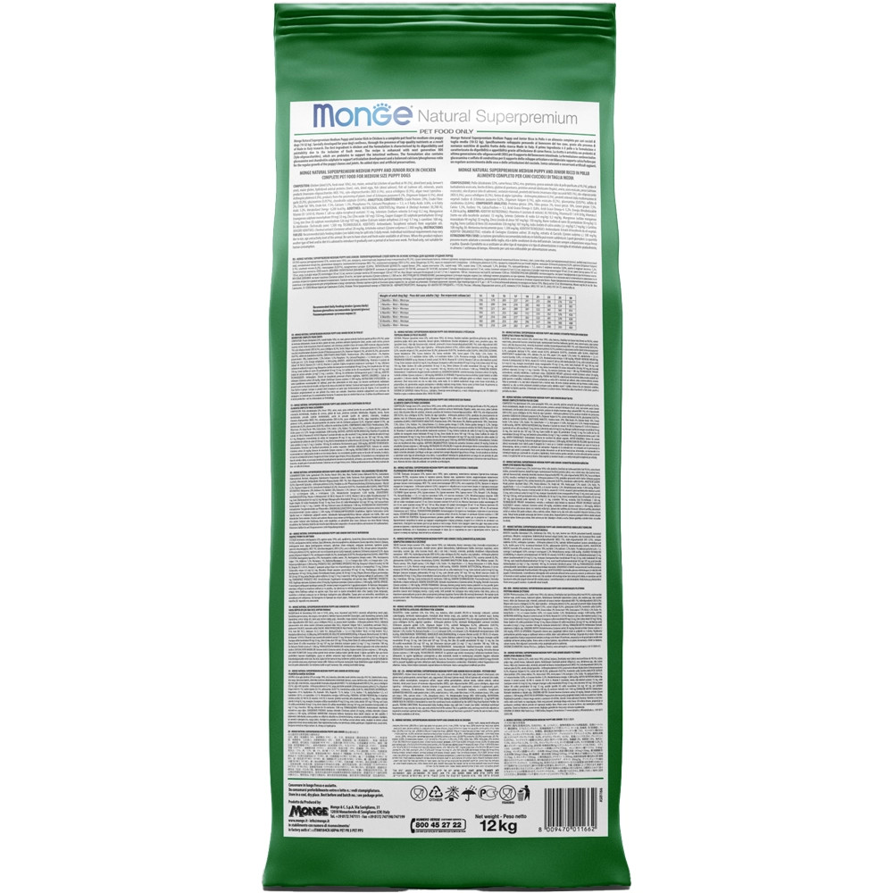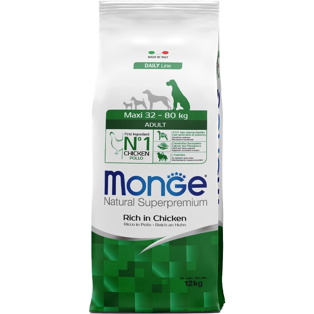 Monge Daily Line Maxi Adult Száraz Kutyatáp (Csirke)Teljes értékű állateledel nagytestű (32-80 kg) felnőtt kutyák számára csirkével. A kiváló minőségű alapanyagoknak és az olasz kutatómunkának köszönhetően egészséges táplálkozást biztosít kutyájának. A termék fő összetevője a csirke, amely könnyen emészthető és a friss hús hozzáadásának köszönhetően nagyon ízletes. A recept xylo-oligoszacharideket és probiotikumokat tartalmaz, amik támogatják a megfelelő bélműködést. Ezenkívül a termék a glükozamin és kondroitin-szulfát révén erősíti az ízületeket és a csontokat, valamint az L-karnitinnek köszönhetően segít megőrizni az ideális testtömeget. Nem tartalmaz mesterséges színezéket és tartósítószert.Összetétel:csirke (szárított 30%, friss hús 10%), rizs, kukorica, állati zsiradék (99,5%-ban tisztított csirkeolaj), szárított répapép, inaktivált sörélesztő, kukoricaglutén, hidrolizált állati fehérjék (máj), hal (szárított lazac), halolaj (lazacolaj), ásványi anyagok, élesztő termékek (mannán-oligoszacharidok MOS 1%), xilo-oligoszacharid (XOS 0. 3%), yucca schidigera (0,3%), algadara (spirulina - Arthrospira platensis 0,3%), glükozamin (0,057%), kondroitin-szulfát (0,04%)Analitikai összetevők:Nyersfehérje: 27%, nyersrost: 2,5%, nyerszsír: 12,5%, nyershamu: 6,2%, kalcium: 1,5%, foszfor: 1,1%, n-3 zsírsavak: 0,5%, n-6 zsírsavak:3,5%Metabolizálható energia: 4 000 kcal/ kgTáplálkozási adalékanyagok/kg:A-vitamin (retinil-acetát) 30 770 NE, D3-vitamin 1 610 NE, E-vitamin (all-rac-alfa-tokoferil-acetát 3a700i) 72 mg, szelén (nátrium-szelenit 0,4 mg) 0. 2 mg, mangán (mangán-szulfát-monohidrát 96 mg) 31 mg, cink (cink-oxid 183 mg) 147 mg, réz (réz(II)-szulfát-pentahidrát 49 mg) 12 mg, vas (vas(II)-szulfát-monohidrát 319 mg) 105 mg, jód (kalcium-jodát vízmentes 2,5 mg) 1,68 mg, L-karnitin: 110 mg, DL-metionin (technikailag tiszta) 1,500 mgTechnológiai adalékanyagok:Antioxidánsok: Tokoferol kivonatok növényi olajokbólÉrzékszervi adalékanyagok:Gesztenye kivonat (Castanea sativa) 20 mg/kg