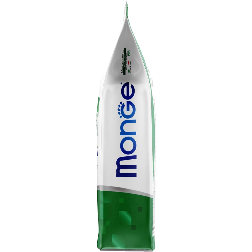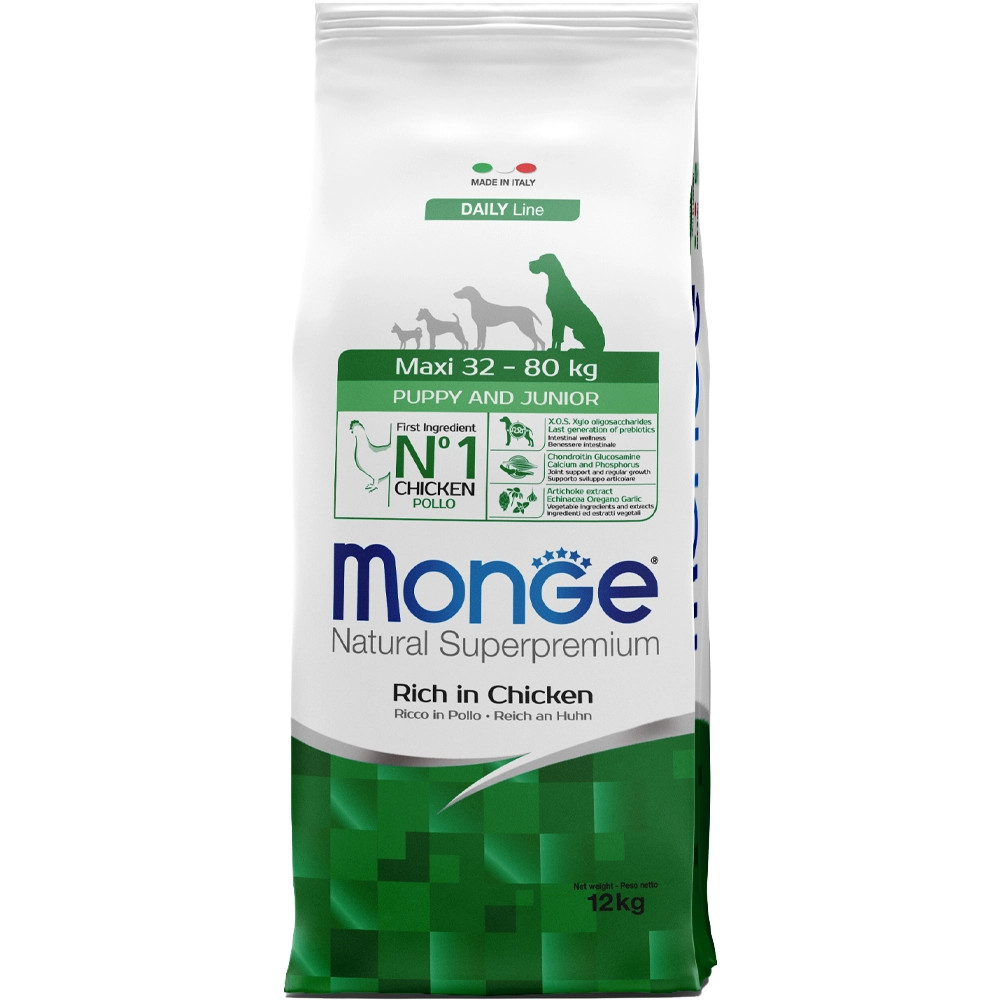 Monge Daily Line Maxi Puppy & Junior Száraz Kutyatáp (Csirke)Teljes értékű állateledel nagytestű (32-80 kg) kölyökkutyák számára csirkével. A kiváló minőségű alapanyagoknak és az olasz kutatómunkának köszönhetően egészséges táplálkozást biztosít kutyájának. A termék fő összetevője a csirke, amely könnyen emészthető és a friss hús hozzáadásának köszönhetően nagyon ízletes. A recept xylo-oligoszacharideket és probiotikumokat tartalmaz, amik támogatják a megfelelő bélműködést. Ezenkívül a termék a glükozamin és kondroitin-szulfát révén erősíti az ízületeket és a csontokat, valamint a megfelelő Ca/P aránynak köszönhetően egészséges növekedést biztosít. Nem tartalmaz mesterséges színezéket és tartósítószert.Összetétel:csirke (szárított 32%, friss hús 10%), rizs, kukorica, állati zsiradék (99,5%-ban tisztított csirkeolaj), szárított répapép, inaktivált sörélesztő, kukoricaglutén, hidrolizált állati fehérjék (máj), zab, szárított tojás, hal (szárított lazac), halolaj (lazacolaj), ásványi anyagok, élesztők (mannán-oligoszacharidok MOS 1%), xilo-oligoszacharid (XOS 0. 3%), yucca schidigera (0,3%), algadara (spirulina - Arthrospira platensis 0,3%), növények feldolgozásából származó termékek (Echinacea purpurea gyökere 0,2%, Origanum Vulgare 0,1%), szárított fokhagyma (0,2%), glükozamin (0,057%), kondroitin-szulfát (0,04%)Analitikai összetevők:Nyersfehérje: 28%, nyersrost: 2%, nyerszsír: 16%, nyershamu: 7%, kalcium: 1,3%, foszfor: 0,8%, kalcium/foszfor = 1,6, n-3 zsírsavak: 0,5%, n-6 zsírsavak: 4,5%Metabolizálható energia: 4 120 kcal/kgTáplálkozási adalékanyagok/kg:A-vitamin (retinil-acetát) 30 700 NE, D3-vitamin 1 610 NE, E-vitamin (all-rac-alfa-tokoferil-acetát 3a700i) 72 mg, szelén (nátrium-szelenit 0,4 mg) 0. 2 mg, mangán (mangán-szulfát-monohidrát 92 mg) 30 mg, cink (cink-oxid 174 mg) 140 mg, réz (réz(II)-szulfát-pentahidrát 47 mg) 12 mg, vas (vas(II)-szulfát-monohidrát 304 mg) 100 mg, jód (kalcium-jodát vízmentes 2,4 mg) 1,6 mg, L-karnitin: 100 mg, DL-metionin (technikailag tiszta): 1 500 mgTechnológiai adalékanyagok:Antioxidánsok: Tokoferol kivonatok növényi olajokbólÉrzékszervi adalékanyagok:Gesztenye kivonat (Castanea sativa) 20 mg/kg, Articsóka kivonat (Cynara scolymus L.) 300 mg/kg