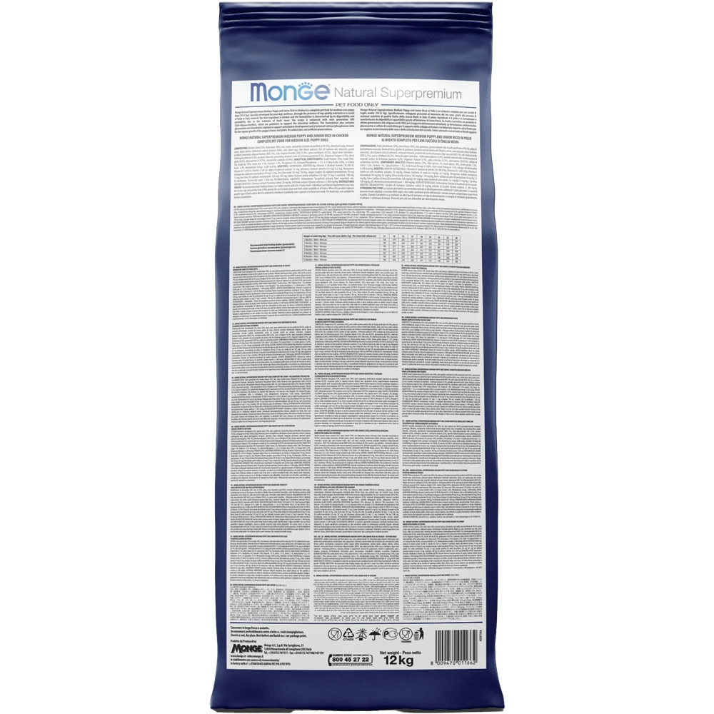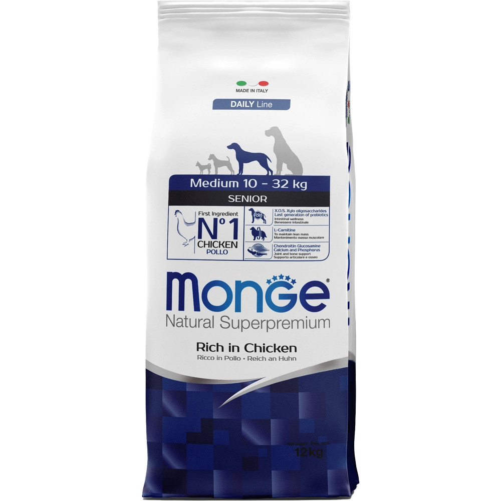 Monge Daily Line Medium Senior Száraz Kutyatáp (Csirke)Teljes értékű állateledel közepes méretű (10-32 kg) idős kutyák számára csirkével. A kiváló minőségű alapanyagoknak és az olasz kutatómunkának köszönhetően egészséges táplálkozást biztosít kutyájának. A termék fő összetevője a csirke, amely könnyen emészthető és a friss hús hozzáadásának köszönhetően nagyon ízletes. A recept xylo-oligoszacharideket és probiotikumokat tartalmaz, amik támogatják a megfelelő bélműködést. Ezenkívül a termék a glükozamin és kondroitin-szulfát révén erősíti az ízületeket és a csontokat, valamint az L-karnitinnek köszönhetően segít megőrizni az ideális testtömeget. Nem tartalmaz mesterséges színezéket és tartósítószert.Összetétel:csirke (szárított 30%, friss hús 10%), rizs, zab, szárított répapép, kukorica, állati zsiradék (99,5%-ban tisztított csirkeolaj), inaktivált sörélesztő, hidrolizált állati fehérjék (máj), burgonyafehérje, szárított tojás, hal (szárított lazac), halolaj (lazacolaj), ásványi anyagok, élesztő termékek (mannán-oligoszacharidok MOS 1%), xilo-oligoszacharid (XOS 0. 3%), yucca schidigera (0,3%), algadara (spirulina - Arthrospira platensis 0,3%), glükozamin (0,057%), kondroitin-szulfát (0,04%)Analitikai összetevők:Nyersfehérje: 26%, nyersrost: 3%, nyerszsír: 13%, nyershamu: 6,5%, kalcium: 1,2%, foszfor: 1%, n-3 zsírsavak: 0,4%, n-6 zsírsavak: 3%Metabolizálható energia: 3 950 kcal/ kgTáplálkozási adalékanyagok/kg:A-vitamin (retinil-acetát) 32 300 NE, D3-vitamin 1 690 NE, E-vitamin (all-rac-alfa-tokoferil-acetát 3a700i) 75 mg, szelén (nátrium-szelenit 0,4 mg) 0. 2 mg, mangán (mangán-szulfát-monohidrát 96 mg) 31 mg, cink (cink-oxid 183 mg) 147 mg, réz (réz(II)-szulfát-pentahidrát 49 mg) 12 mg, vas (vas(II)-szulfát-monohidrát 319 mg) 105 mg, jód (kalcium-jodát vízmentes 2,5 mg) 1,68 mg, L-karnitin: 130 mg, DL-metionin (technikailag tiszta) 1,500 mgTechnológiai adalékanyagok:Antioxidánsok: Tokoferol kivonatok növényi olajokbólÉrzékszervi adalékanyagok:Gesztenye kivonat (Castanea sativa) 20 mg/kg