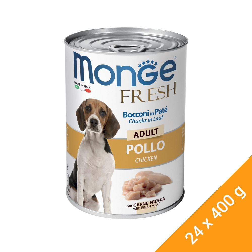 Monge Fresh Chunks in Loaf Adult Konzerv Kutyáknak (Csirke)A Monge Fresh egy finom termékcsalád, amely tagjaiban ízletes és ropogós húsdarabok találkoznak. A különleges textúrát több mint 50 évnyi nedves gyártási tapasztalat után fejlesztették ki. Forró gőzzel történő feldolgozás, húsdarabok pástétomban, zöldségdarabokkal. Tiszta receptúra alapján, alapvető összetevőkből készülő eledelek, mint pl. a friss hús, amely által rendkívül emészthetőek a falatok. A zöldségek pedig ideális szénhidrátforrások, amelyek biztosítják a napi energiát, valamint vitaminok és ásványi anyagok forrásai is.Kiegyensúlyozott, teljes értékű állateledel felnőtt kutyák számára. A friss borjúhúsnak köszönhetően könnyen emészthető és magas biológiai értékkel rendelkező termék.Összetétel:Hús és származékai (friss hús; csirke 26% és sertésmáj 15%), gabonafélék, olajok és zsírok, ásványi anyagok, tejfehérjeporAnalitikai összetevők:Nyersfehérje: 7,5%, Nyersrost: 0,5%, Nyerszsír: 6,5%, Nyershamu: 2,0%, Nedvesség: 78%Táplálkozási adalékanyagok/kg:D3-vitamin 450 NE, E-vitamin (all-rac-alfa-tokoferil-acetát 3a700i) 15 mg, szelén (nátrium-szelenit 0,04 mg) 0,018 mg, mangán (mangán-szulfát-monohidrát 9 mg) 2,9 mg, cink (cink-oxid 32 mg): 25,7 mg, Réz (Réz(II)-szulfát-pentahidrát 3,5 mg) 0,89 mg, Vas (Vas(II)-szulfát-monohidrát15 mg) 4,93 mg, Jód (Kalcium-jodát vízmentes 1,8 mg) 1,17 mg