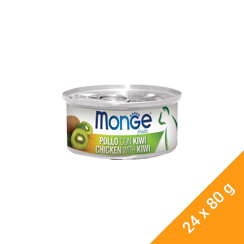 Monge Fruits Gyümölcsös Macskaeledel (Csirke és Kiwi)Kiegészítő macskaeledel a természetes táplálást szolgáló Monge Natural Superpremium termékek mellé. Különösen alkalmas válogatós macskák számára. A recept alapja a finom csirkehús, ami kiwivel gazdagítva biztosítja a természetes vitamin- és gyümölcsellátást. Az összes nyersanyagot és összetevőt a termelési folyamat során szelektálják és ellenőrzik, a gyümölcsöket nem kezelik kémiai úton, ezért tartósítószert és színezéket nem tartalmaz. A gőzzel történő főzésnek köszönhetően ízletesebb és különlegesebb.Összetevők:Csirke 55%, kiwi 5%, rizs, frukto-oligoszacharidek (F.O.S.) 400mg/kgAnalitikai összetevők:Nedvesség 82%, Nyersfehérje 13%, Nyersrost 1%, Olajok és zsírok 0,5%, Nyershamu 2%Táplálkozási adalékanyagok:Vitamin E (alpha tocopherol) 50mg/kg