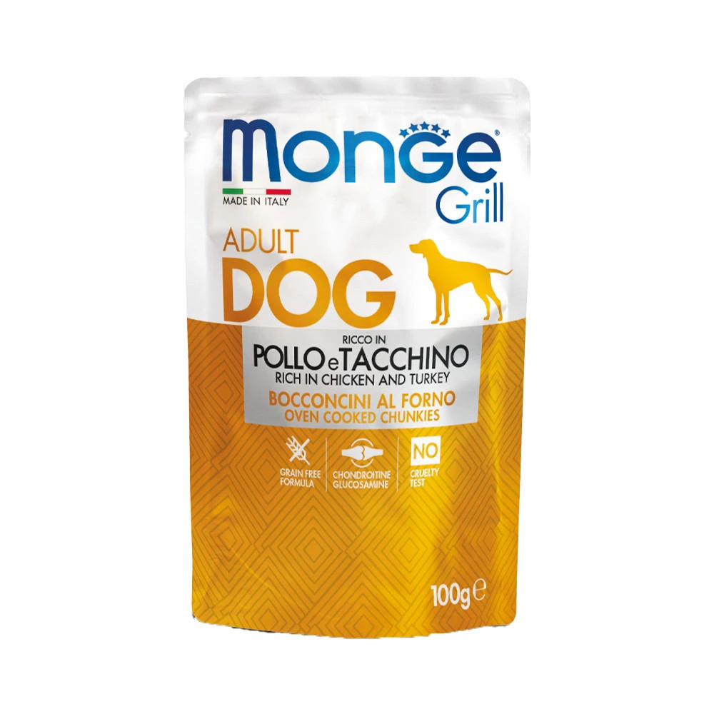 Monge Grill Adult Alutasakos Kutyaeledel (Csirke és Pulyka)A Monge Grill kemencében sült eledelek lehetővé teszik, hogy kutyája közelebb kerüljön az ideális étrendhez. A Monge Grill receptek kiváló állati fehérjeforrásokat tartalmaznak, amelyeket tápértékük alapján válogatnak össze. Optimális termék, amely tiszteletben tartja a különböző életkori szakaszokban és élettani állapotokban jelentkező táplálkozási igényeket.Teljes értékű állateledel felnőtt kutyák részére. Kifejezetten négylábú barátaink ízlésére fejlesztve. Sült csirke-, illetve pulykahúst tartalmaz. Gabonamentes eledel glükozaminnal én kondroitinnal az ízületek erősítése érdekében.Összetevők:Hús és származékai 40% (csirke 14% és pulyka 14%), ásványi anyagok, glükozamin 0,008%, kondroitin-szulfát 0,004%Analitikai összetevők:Nyersfehérje 9%, Nyersrost 0,5%, Olajok és zsírok 7%, Nyershamu 1,6%, Nedvesség 78,5%Táplálkozási adalékanyagok/kg:D3-vitamin 250 NE, E-vitamin (all-rac-alfa-tokoferil-acetát 3a700i) 8 mg