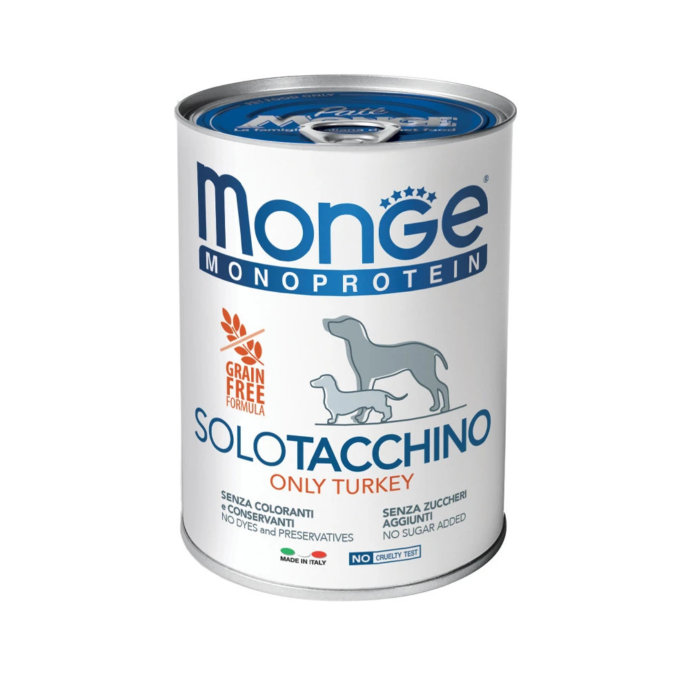 Monge Monoprotein Pate Konzerv Kutyáknak (100% Pulyka)A Monge Monoprotein Superpremium a Monge kínálatának legfelső szintjét képviseli. A termékek magas minőségét a színezőanyagok és tartósítószerek nélküli, speciálisan az egyes receptúrákhoz kiválasztott és vizsgált nyersanyagok használata garantálja. Minden egyes eledel igazi élvezet lesz a kutyák számára, köszönhetően az első osztályú friss húsok használatának és a táplálkozási tulajdonságaik miatt speciálisan kiválasztott összetevők jelenlétének.Teljes értékű, kiegyensúlyozott állateledel felnőtt kutyák számára. Kizárólag* magas minőségű, pulykahúsból származó fehérjét tartalmaz. Nagyon ízletes, 100% -ban olasz termék. Kiegyensúlyozott táplálék, amely A-E-D3 vitamin komplexet és szükséges mikroelemeket tartalmaz. Természetesen színezőanyagok, tartósítószerek és hozzáadott cukor nélkül készül.*Nyomokban tartalmazhat más fehérjeforrást isÖsszetétel:Friss pulyka (a felhasznált hús 100%-a), ásványi anyagokAnalitikai összetevők:Nyersfehérje 8%, nyersrost 0,5%, nyerszsír 6,5%, nyershamu 1,5%, nedvességtartalom 80%Táplálkozási adalékanyagok/kg:A-vitamin (retinil-acetát) 1500 NE, D3-vitamin 120 NE, E-vitamin (összes rac-alfa-tokoferil-acetát 3a700i) 25 mg, cink (cink-oxid 31 mg) 25 mg, jód (kalcium-jodát vízmentes 0,43 mg) 0,28 mg, mangán (mangán-szulfát-monohidrát 3,8 mg) 1,25 mg, vas (vas(II)-szulfát-monohidrát 61 mg) 20 mg