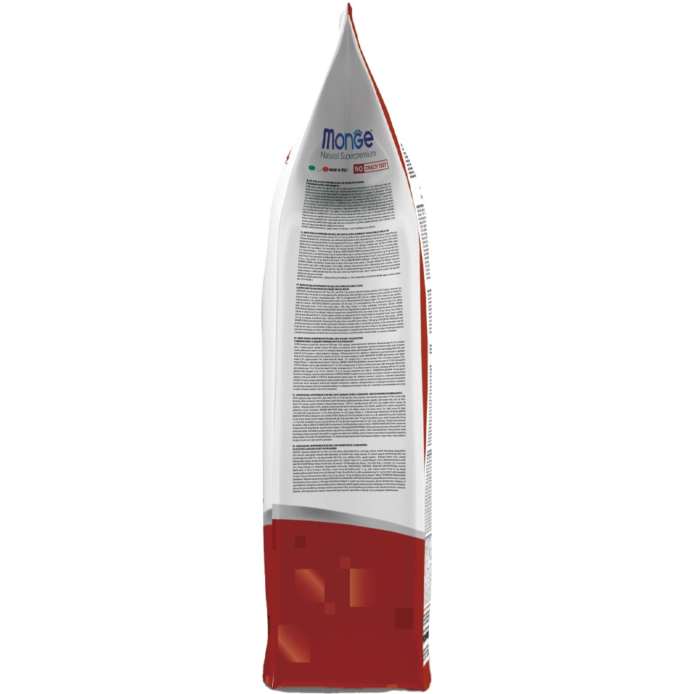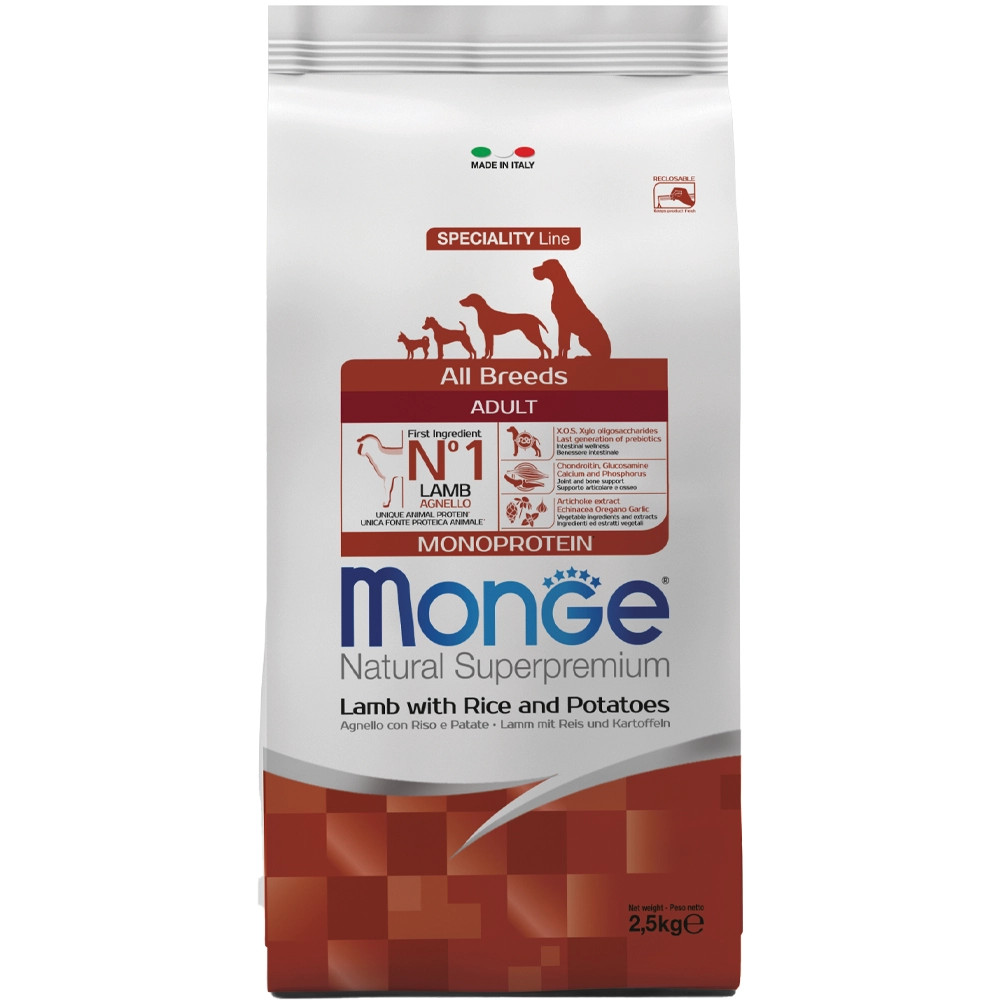 Monge Speciality Line Adult Monoprotein Száraz Kutyatáp (Bárány, Rizs és Burgonya)Teljes értékű állateledel felnőtt kutyák számára báránnyal, rizzsel és burgonyával. A kiváló minőségű alapanyagoknak és az olasz kutatómunkának köszönhetően egészséges táplálkozást biztosít kutyájának. Kizárólag egyféle* állati eredetű fehérjét tartalmaz. A termék fő összetevője a bárány, amely könnyen emészthető és a friss hús hozzáadásának köszönhetően nagyon ízletes. A recept xylo-oligoszacharideket és probiotikumokat tartalmaz, amik támogatják a megfelelő bélműködést, valamint megtalálhatók olyan növényi eredetű alapanyagok és kivonatok, mint az Echinacea, oregánó, fokhagyma és articsóka kivonat. Ezenkívül a termék glükozamint és kondroitin-szulfátot tartalmaz az ízületek és a csontok erősítésének céljából. Nem tartalmaz mesterséges színezéket és tartósítószert.*Nyomokban tartalmazhat más fehérjeforrást isÖsszetétel:Bárányhús (szárított 28%, friss hús 10%), rizs (15%), burgonyafehérje (5%), állati zsiradék (99,5%-ban tisztított csirkeolaj), kukorica, szárított cukorrépapép, inaktivált sörélesztő, hidrolizált állati fehérjék (máj), ásványi anyagok, élesztőkészítmények (mannán-oligoszacharidok MOS 1%), xilo-oligoszacharid (XOS 0. 3%), yucca schidigera (0,3%), algadara (spirulina - Arthrospira platensis 0,3%), növények feldolgozásából származó termékek (Echinacea purpurea gyökere 0,2%, Origanum Vulgare 0,1%), szárított fokhagyma (0,2%), glükozamin (0,057%), kondroitin-szulfát (0,04%)Analitikai összetevők:Nyersfehérje: 25%, nyersrost: 2,2%, nyerszsír: 16%, nyershamu: 7,5%, kalcium: 1,6%, foszfor: 1,2%, n-3 zsírsavak: 0,6%, n-6 zsírsavak: 4%Metabolizálható energia: 4 100 kcal/kgTáplálkozási adalékanyagok/kg:A-vitamin (retinil-acetát) 30 770 NE, D3-vitamin 1 610 NE, E-vitamin (all-rac-alfa-tokoferilacetát 3a700i) 72 mg, szelén (nátrium-szelenit 0,4 mg) 0. 2 mg, mangán (mangán-szulfát-monohidrát 92 mg) 30 mg, cink (cink-oxid 174 mg) 140 mg, réz (réz(II)-szulfát-pentahidrát 47 mg) 12 mg, vas (vas(II)-szulfát-monohidrát 304 mg) 100 mg, jód (kalcium-jodát vízmentes 2,4 mg) 1,6 mg, L-karnitin: 100 mg, DL-metionin (technikailag tiszta) 1,500 mgTechnológiai adalékanyagok:Antioxidánsok: Tokoferol kivonatok növényi olajokbólÉrzékszervi adalékanyagok:Gesztenye kivonat (Castanea sativa) 20 mg/kg, Articsóka kivonat (Cynara scolymus L.) 300 mg/kg