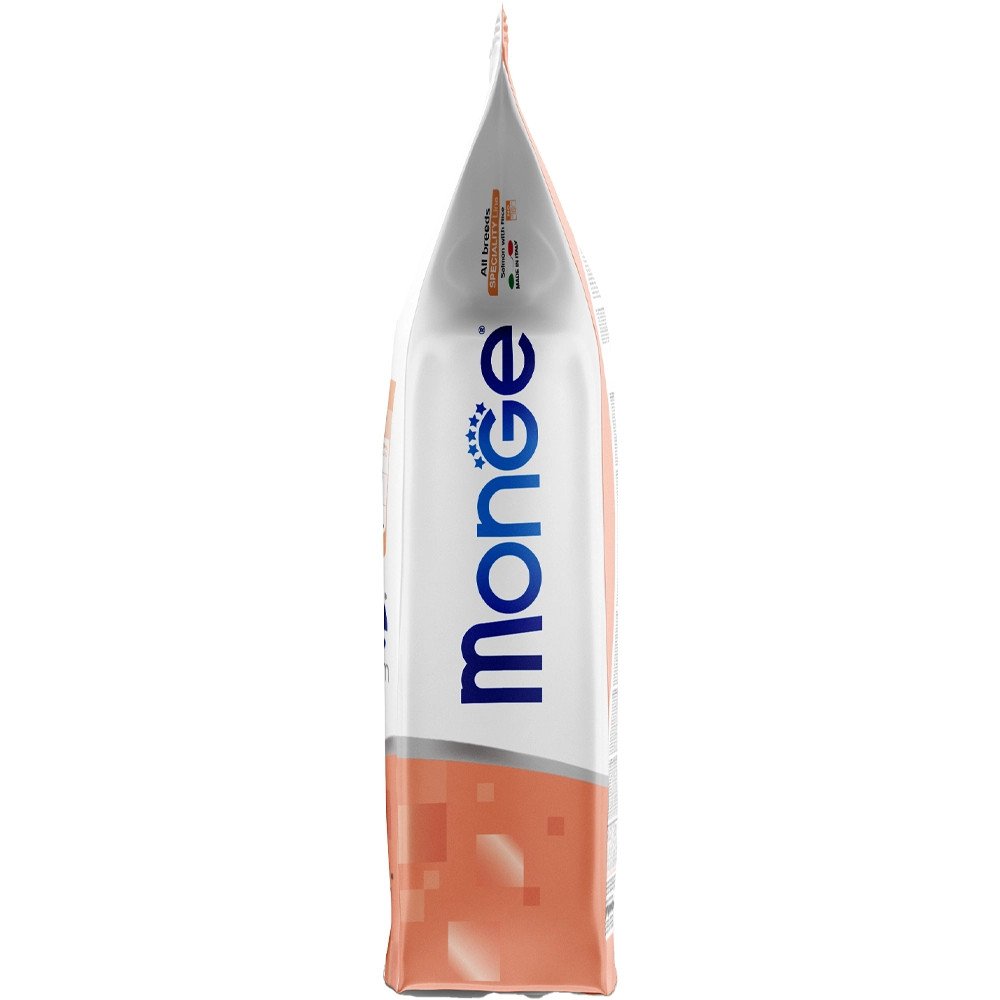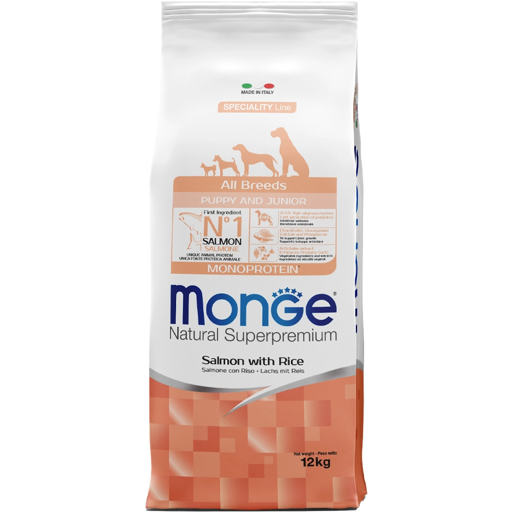Monge Speciality Line Puppy & Junior Monoprotein Száraz Kutyatáp (Lazac és Rizs)Teljes értékű állateledel kölyökkutyák számára. Kutyája egészsége garantált a kiváló minőségű alapanyagoknak és az olasz szakértői kutatásnak köszönhetően. Kizárólag egyféle* állati eredetű fehérjét tartalmaz. Fő összetevője a lazac, ami könnyen emészthető és a hozzáadott friss halnak köszönhetően nagyon ízletes. A termék xylo-oligoszacharideket és probiotikumokat tartalmaz, amik támogatják a megfelelő emésztést. Ezenkívül a termék glükozamint és kondroitin-szulfátot tartalmaz az ízületek és csontok egészséges fejlődése érdekében. Nem tartalmaz hozzáadott színezéket és mesterséges tartósítószert.*Nyomokban tartalmazhat más fehérjeforrást isÖsszetétel:Hal (szárított lazac 26%, friss lazac 10%), rizs (15%), burgonyafehérje, kukorica, szárított répapép, kukoricaglutén, inaktivált sörélesztő, hidrolizált állati fehérjék (máj), állati zsír (99,5%-ban tisztított csirkeolaj), zab, ásványi anyagok, élesztőfélék (mannán-oligoszacharidok MOS 1%), xilo-oligoszacharid (XOS 0. 3%), yucca schidigera (0,3%), algaliszt (spirulina - Arthrospira platensis 0,3%), növények feldolgozásából származó termékek (Echinacea purpurea gyökere 0,2%, Origanum Vulgare 0,1%), szárított fokhagyma (0,2%), glükozamin (0,057%), kondroitin-szulfát (0,04%)Analitikai összetevők:Nyersfehérje: 31%, nyersrost: 2%, nyerszsír: 18%, nyershamu: 6%, kalcium: 1,4%, foszfor: 1,1%, kalcium/foszfor = 1,3, n-3 zsírsavak: 0,65%, n-6 zsírsavak: 5%Metabolizálható energia: 4260 kcal/kgTáplálkozási adalékanyagok/kg:A-vitamin (retinil-acetát) 30 700 NE, D3-vitamin 1 610 NE, E-vitamin (all-rac-alfa-tokoferil-acetát 3a700i) 72 mg, szelén (nátrium-szelenit 0,4 mg) 0. 2 mg, mangán (mangán-szulfát-monohidrát 92 mg) 30 mg, cink (cink-oxid 174 mg) 140 mg, réz (réz(II)-szulfát-pentahidrát 47 mg) 12 mg, vas (vas(II)-szulfát-monohidrát 304 mg) 100 mg, jód (kalcium-jodát vízmentes 2,4 mg) 1,6 mg, L-karnitin: 150 mg, DL-metionin (technikailag tiszta) 1,400 mgTechnológiai adalékanyagok:Antioxidánsok: Tokoferol kivonatok növényi olajokbólÉrzékszervi adalékanyagok:Gesztenye kivonat (Castanea sativa) 20 mg/kg, Articsóka kivonat (Cynara scolymus L.) 300 mg/kg