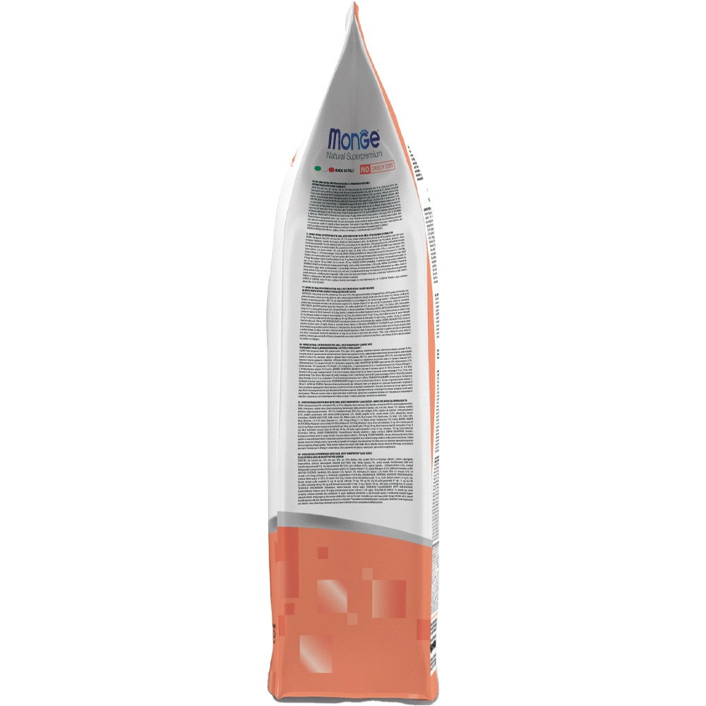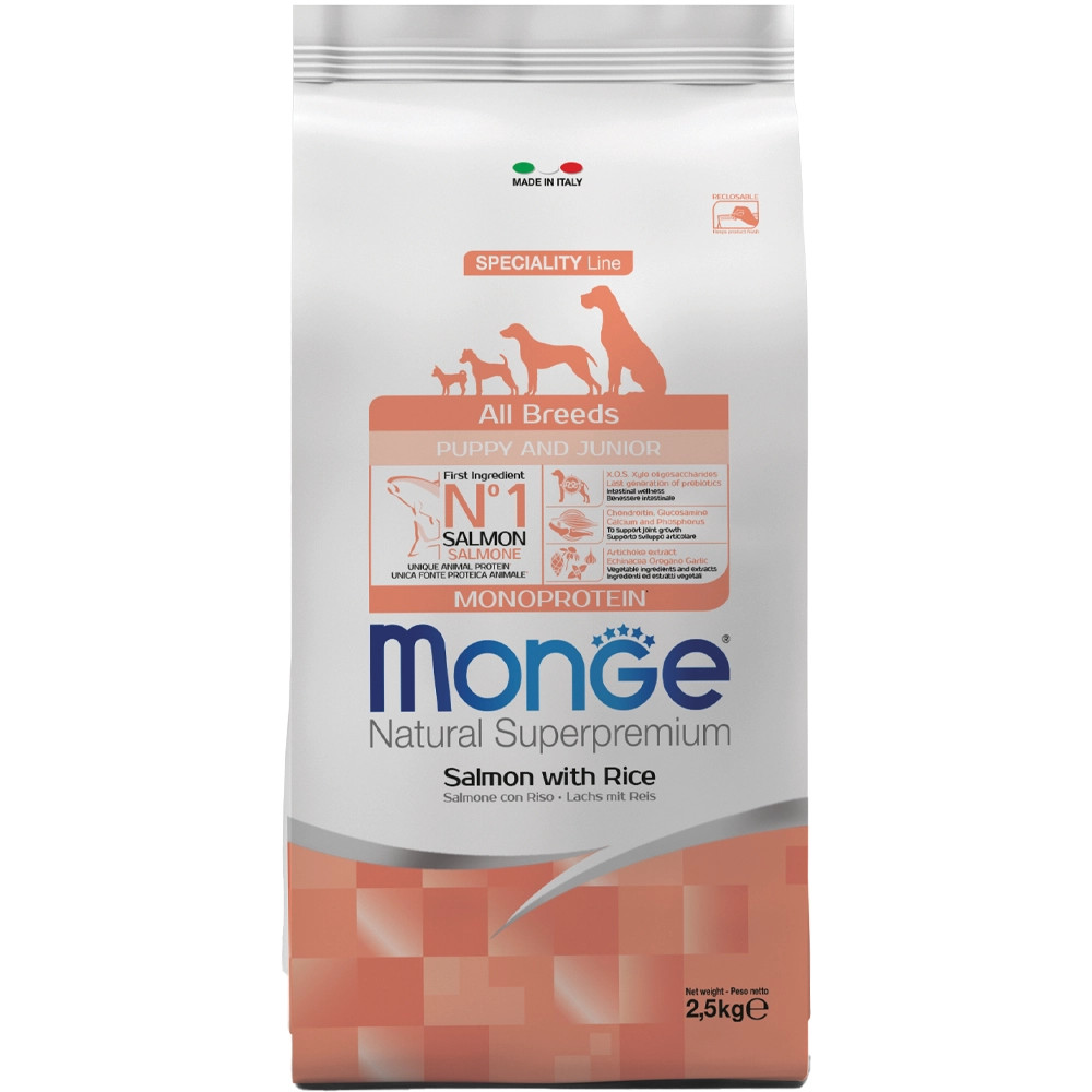 Monge Speciality Line Puppy & Junior Monoprotein Száraz Kutyatáp (Lazac és Rizs)Teljes értékű állateledel kölyökkutyák számára. Kutyája egészsége garantált a kiváló minőségű alapanyagoknak és az olasz szakértői kutatásnak köszönhetően. Kizárólag egyféle* állati eredetű fehérjét tartalmaz. Fő összetevője a lazac, ami könnyen emészthető és a hozzáadott friss halnak köszönhetően nagyon ízletes. A termék xylo-oligoszacharideket és probiotikumokat tartalmaz, amik támogatják a megfelelő emésztést. Ezenkívül a termék glükozamint és kondroitin-szulfátot tartalmaz az ízületek és csontok egészséges fejlődése érdekében. Nem tartalmaz hozzáadott színezéket és mesterséges tartósítószert.*Nyomokban tartalmazhat más fehérjeforrást isÖsszetétel:Hal (szárított lazac 26%, friss lazac 10%), rizs (15%), burgonyafehérje, kukorica, szárított répapép, kukoricaglutén, inaktivált sörélesztő, hidrolizált állati fehérjék (máj), állati zsír (99,5%-ban tisztított csirkeolaj), zab, ásványi anyagok, élesztőfélék (mannán-oligoszacharidok MOS 1%), xilo-oligoszacharid (XOS 0. 3%), yucca schidigera (0,3%), algaliszt (spirulina - Arthrospira platensis 0,3%), növények feldolgozásából származó termékek (Echinacea purpurea gyökere 0,2%, Origanum Vulgare 0,1%), szárított fokhagyma (0,2%), glükozamin (0,057%), kondroitin-szulfát (0,04%)Analitikai összetevők:Nyersfehérje: 31%, nyersrost: 2%, nyerszsír: 18%, nyershamu: 6%, kalcium: 1,4%, foszfor: 1,1%, kalcium/foszfor = 1,3, n-3 zsírsavak: 0,65%, n-6 zsírsavak: 5%Metabolizálható energia: 4260 kcal/kgTáplálkozási adalékanyagok/kg:A-vitamin (retinil-acetát) 30 700 NE, D3-vitamin 1 610 NE, E-vitamin (all-rac-alfa-tokoferil-acetát 3a700i) 72 mg, szelén (nátrium-szelenit 0,4 mg) 0. 2 mg, mangán (mangán-szulfát-monohidrát 92 mg) 30 mg, cink (cink-oxid 174 mg) 140 mg, réz (réz(II)-szulfát-pentahidrát 47 mg) 12 mg, vas (vas(II)-szulfát-monohidrát 304 mg) 100 mg, jód (kalcium-jodát vízmentes 2,4 mg) 1,6 mg, L-karnitin: 150 mg, DL-metionin (technikailag tiszta) 1,400 mgTechnológiai adalékanyagok:Antioxidánsok: Tokoferol kivonatok növényi olajokbólÉrzékszervi adalékanyagok:Gesztenye kivonat (Castanea sativa) 20 mg/kg, Articsóka kivonat (Cynara scolymus L.) 300 mg/kg