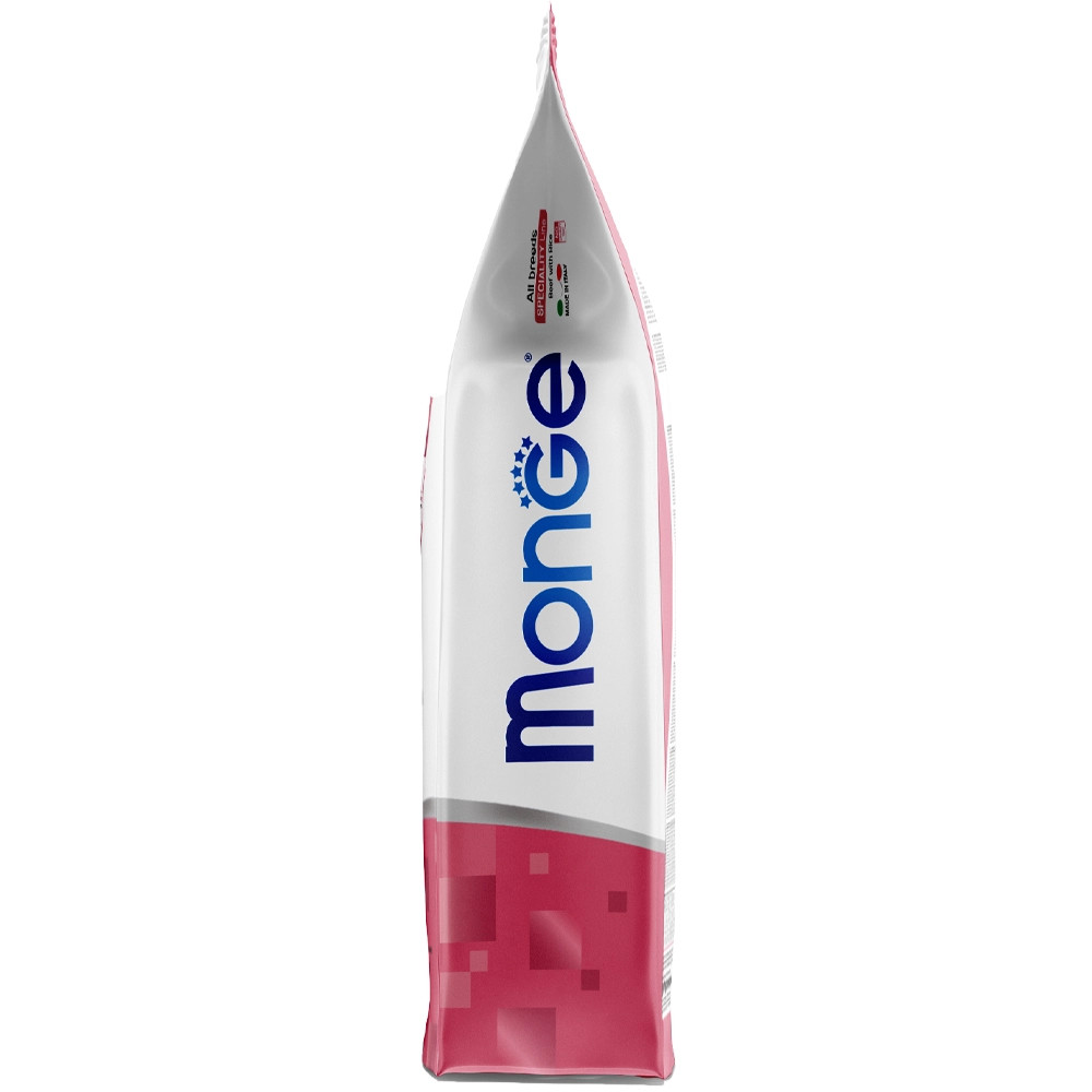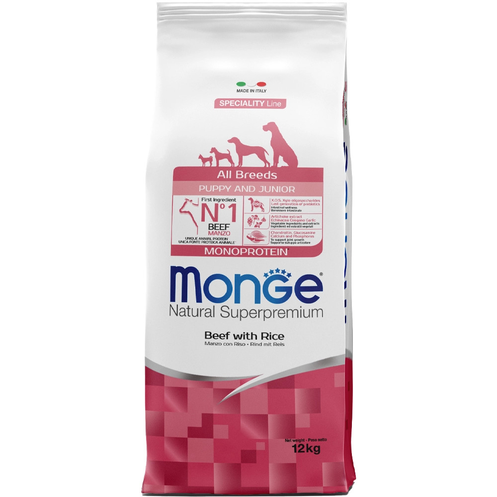 Monge Speciality Line Puppy & Junior Monoprotein Száraz Kutyatáp (Marha és Rizs)Teljes értékű állateledel kölyökkutyák számára. Kutyája egészsége garantált a kiváló minőségű alapanyagoknak és az olasz szakértői kutatásnak köszönhetően. Kizárólag egyféle* állati eredetű fehérjét tartalmaz. Fő összetevője a marha, ami könnyen emészthető és a hozzáadott friss húsnak köszönhetően nagyon ízletes. A termék xylo-oligoszacharideket és probiotikumokat tartalmaz, amik támogatják a megfelelő emésztést. Ezenkívül a termék glükozamint és kondroitin-szulfátot tartalmaz az ízületek és csontok egészséges fejlődése érdekében. Nem tartalmaz hozzáadott színezéket és mesterséges tartósítószert.*Nyomokban tartalmazhat más fehérjeforrást isÖsszetétel:marhahús (szárított 30%, friss hús 10%), rizs (15%), kukorica, állati zsiradék (99,5%-ban tisztított csirkeolaj), burgonyafehérje, inaktivált sörélesztő, burgonya, szárított répapép, hidrolizált állati fehérjék (máj), halolaj (lazacolaj), ásványi anyagok, élesztőfélék (mannán-oligoszacharidok MOS 1%), xilo-oligoszacharid (XOS 0. 3%), yucca schidigera (0,3%), algadara (spirulina - Arthrospira platensis 0,3%), növények feldolgozásából származó termékek (Echinacea purpurea gyökere 0,2%, Origanum Vulgare 0,1%), szárított fokhagyma (0,2%), glükozamin (0,057%), kondroitin-szulfát (0,04%)Analitikai összetevők:Nyersfehérje: 31%, nyersrost: 2%, nyerszsír: 17%, nyershamu: 7%, kalcium: 1,6%, foszfor: 1,1%, kalcium/foszfor = 1,4, n-3 zsírsavak: 0,5%, n-6 zsírsavak: 4%Metabolizálható energia: 4,170 kcal/kgTáplálkozási adalékanyagok/kg:A-vitamin (retinil-acetát) 35 300 NE, D3-vitamin 1 850 NE, E-vitamin (all-rac-alfa-tokoferil-acetát 3a700i) 82 mg, szelén (nátrium-szelenit 0,38 mg) 0. 17 mg, mangán (mangán-szulfát-monohidrát 80 mg) 26 mg, cink (cink-oxid 152 mg) 122 mg, réz (réz(II)-szulfát-pentahidrát 41 mg) 10,5 mg, vas (vas(II)-szulfát-monohidrát 266 mg) 87,5 mg, jód (kalcium-jodát vízmentes 2,1 mg) 1,4 mg, L-karnitin: 100 mg, DL-metionin (technikailag tiszta) 1,500 mgTechnológiai adalékanyagok:Antioxidánsok: Tokoferol kivonatok növényi olajokbólÉrzékszervi adalékanyagok:Gesztenye kivonat (Castanea sativa) 20 mg/kg, Articsóka kivonat (Cynara scolymus L.) 300 mg/kg