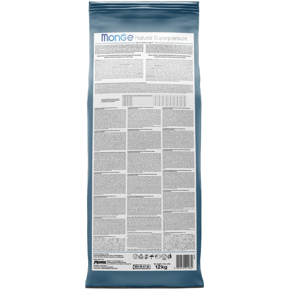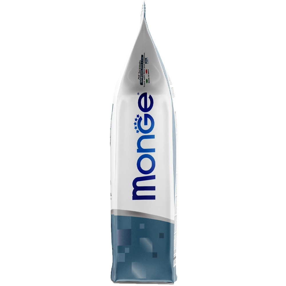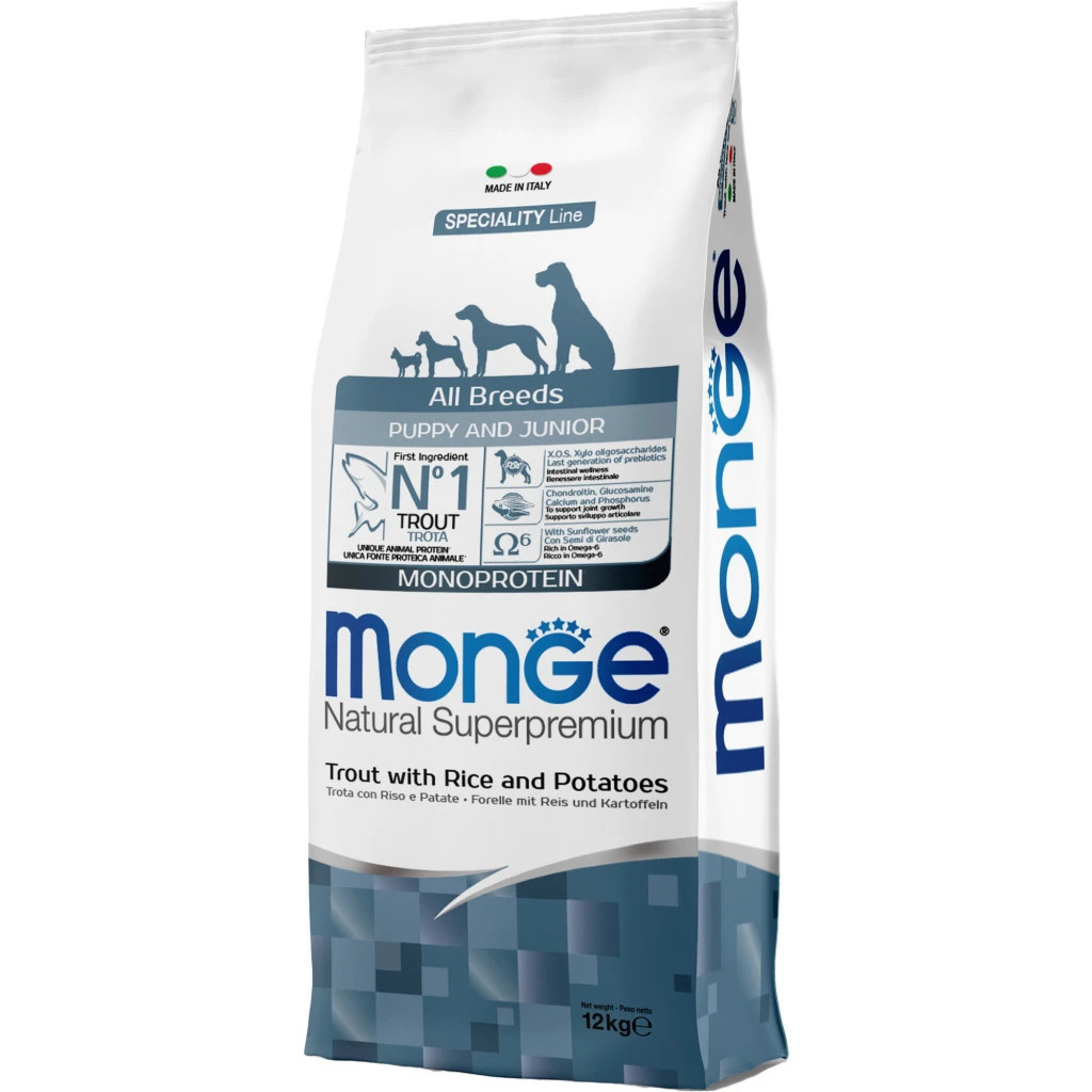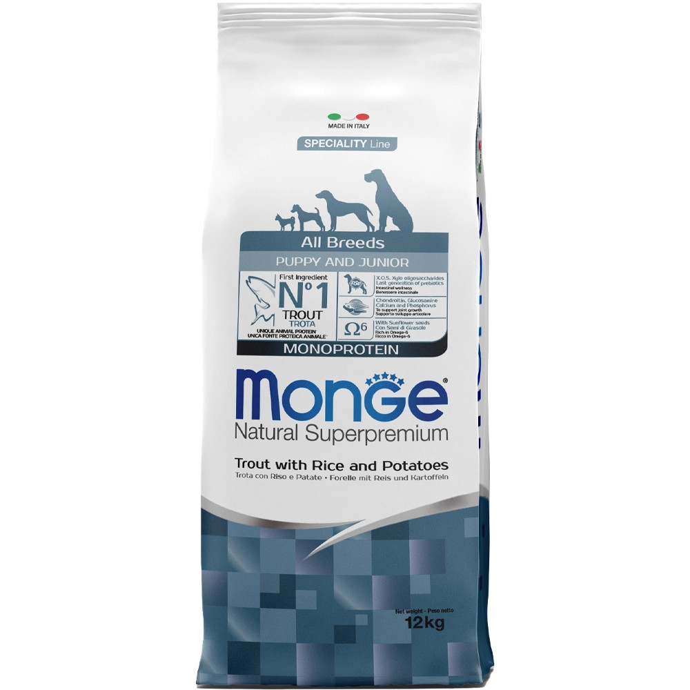 Monge Speciality Line Puppy & Junior Monoprotein Száraz Kutyatáp (Pisztráng, Rizs és Burgonya)Teljes értékű állateledel kölyökkutyák számára. Kutyája egészsége garantált a kiváló minőségű alapanyagoknak és az olasz szakértői kutatásnak köszönhetően. Kizárólag egyféle* állati eredetű fehérjét tartalmaz. Fő összetevője a pisztráng, ami könnyen emészthető és a hozzáadott friss halnak köszönhetően nagyon ízletes. A termék xylo-oligoszacharideket és probiotikumokat tartalmaz, amik támogatják a megfelelő emésztést. Ezenkívül a termék glükozamint és kondroitin-szulfátot tartalmaz az ízületek és csontok egészséges fejlődése érdekében. Nem tartalmaz hozzáadott színezéket és mesterséges tartósítószert.*Nyomokban tartalmazhat más fehérjeforrást isÖsszetétel:Pisztráng (szárítva 32%, frissen 10%), barna rizs (15%), állati zsiradék (99,5%-ban tisztított csirkezsír), kukorica, burgonyafehérje, burgonya (4%), kukoricaglutén, inaktivált sörélesztő, szárított cukorrépapép, hidrolizált állati fehérjék (máj), halolaj (lazacolaj), napraforgómag (1%), ásványi anyagok, élesztők (mannán-oligoszacharidok MOS 1%), xylooligoszacharid (XOS 0. 3%), yucca schidigera (0,3%), algaliszt (spirulina -Arthrospira platensis 0,3%), növények feldolgozásából származó termékek (Echinacea purpurea gyökere 0,2%, Origanum Vulgare 0,1%), szárított fokhagyma (0,2%), glükozamin (0,057%), kondroitin-szulfát (0,04%)Analitikai összetevők:Nyersfehérje: 31,5%, nyersrost: 1,9%, nyerszsír: 18,5%, nyershamu: 5,5%, kalcium: 1,1%, foszfor: 0,7%, kalcium/foszfor=1,5, n-3 zsírsavak: 0,5%, n-6 zsírsavak: 4,5%Metabolizálható energia: 4,309 kcal/kgTáplálkozási adalékanyagok/kg:A-vitamin (retinil-acetát) 32,308 NE, D3-vitamin 1,690 NE, E-vitamin (all-rac-alfa-tokoferil-acetát 3a700i) 175 mg, szelén (nátrium-szelenit 0,38 mg) 0. 18 mg, mangán (mangán-szulfát-monohidrát 80 mg) 26 mg, cink (cink-oxid 152 mg) 122 mg, réz (réz(II)-szulfát-pentahidrát 41 mg) 10,5 mg, vas (vas(II)-szulfát-monohidrát 266 mg) 87,5 mg, jód (kalcium-jodát vízmentes 2,15 mg) 1,4 mg, L-karnitin: 135 mg, DL-metionin (technikailag tiszta): 1 370 mgTechnológiai adalékanyagok:Antioxidánsok: Tokoferol kivonatok növényi olajokbólÉrzékszervi adalékanyagok:Gesztenye kivonat (Castanea sativa) 20 mg/ kg, Articsóka kivonat (Cynara scolymus L.) 300 mg/kg
