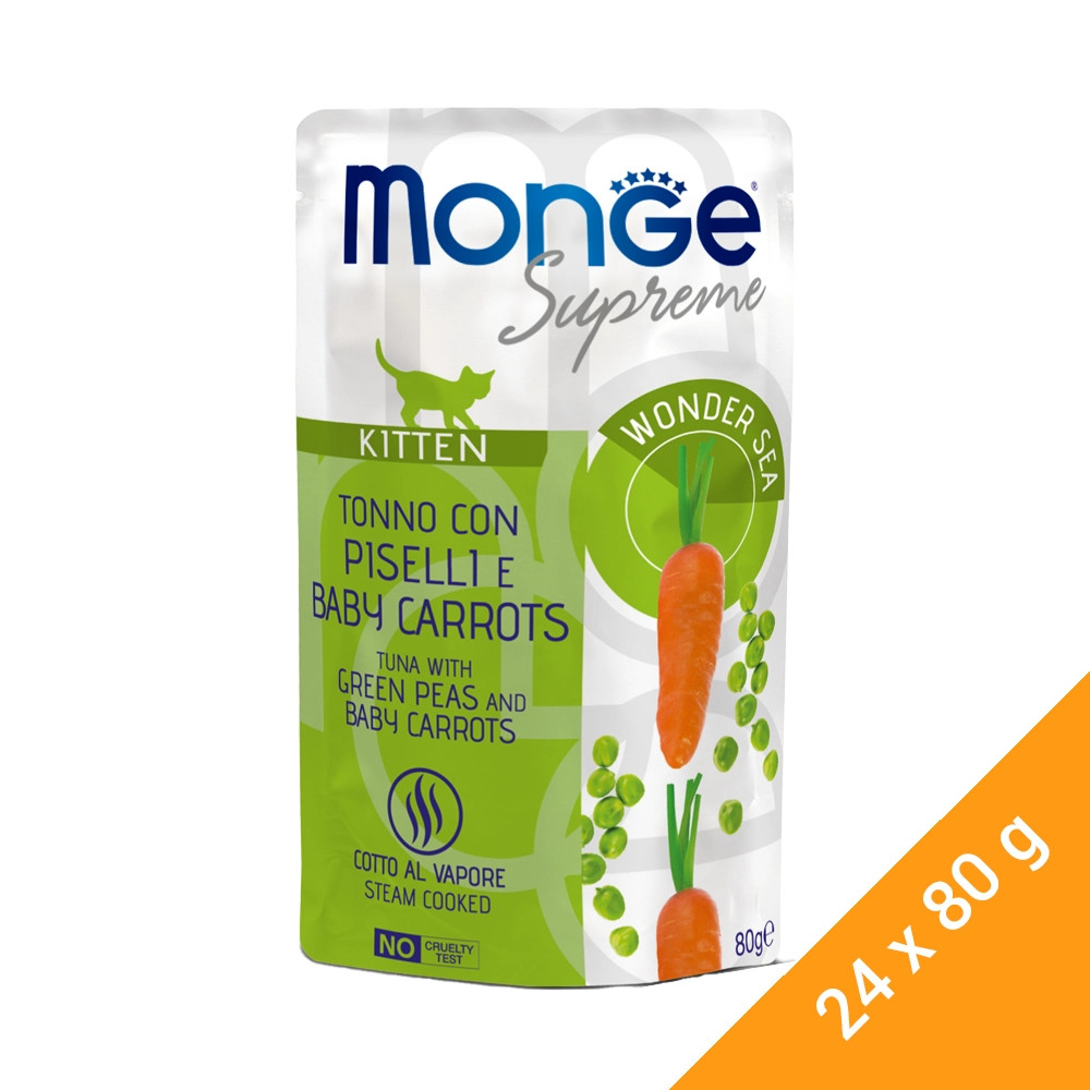 A Monge supreme kitten tonhallal borsóval és bébirépával kiegyensúlyozott állateledel növekvő cicák számára. Kifejezetten úgy lett összeállítva, hogy támogassa a cica napi vitalitását a zöldborsónak, a természetes fehérjeforrásnak köszönhetően. Az első összetevő az óceáni tonhal, a készítmény pedig frukto-oligoszacharidokkal, prebiotikumokkal gazdagított, amelyek támogatják a bélrendszer jólétét.