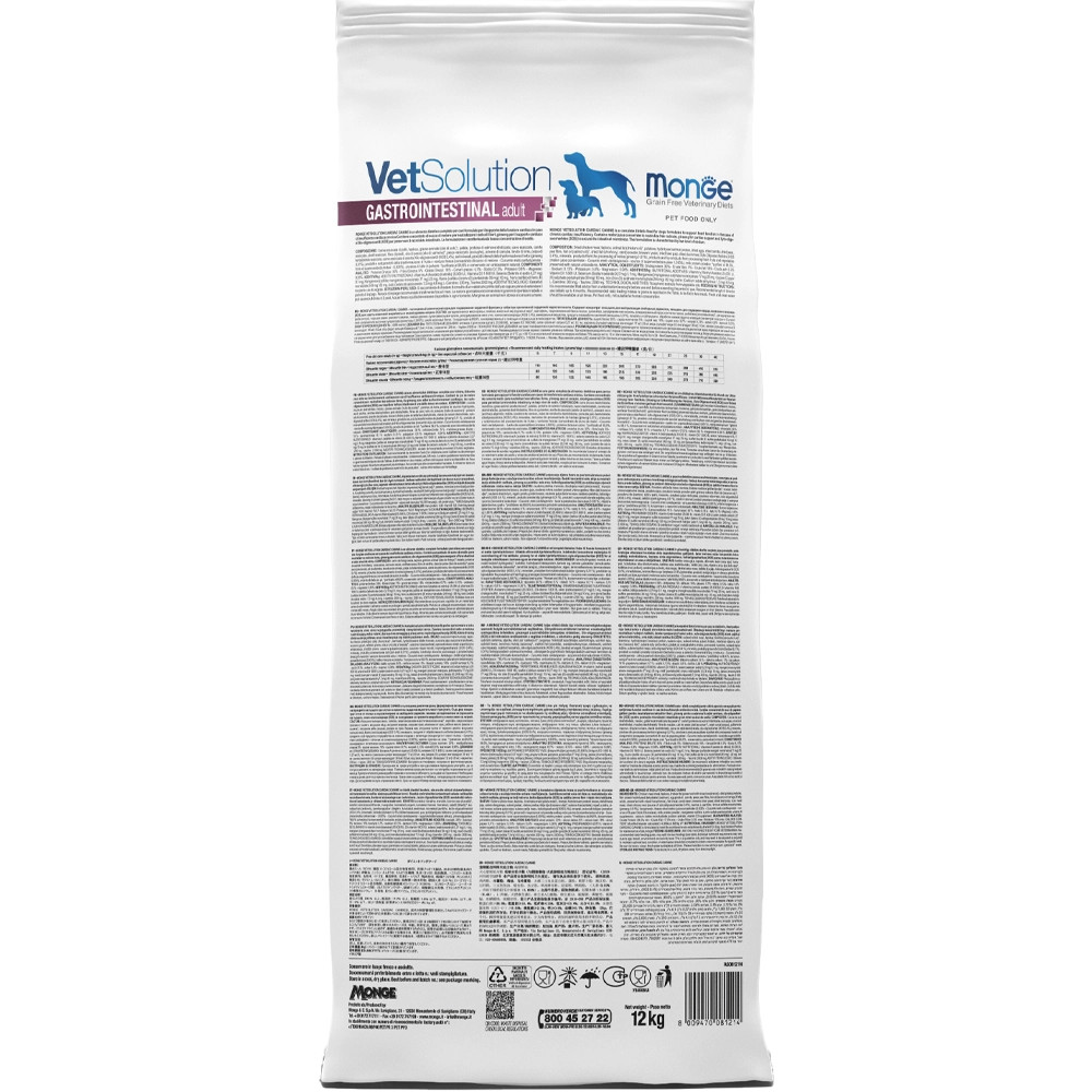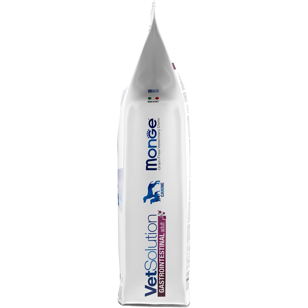 A Monge VetSolution Gastrointestinal Canine Adult problémákra egy teljes értékű diétás táplálék kutyák számára, amelynek összetétele a bél felszívódási zavarainak csökkentésére lett kialakítva. Tartalmaz dinnye koncentrátumot a szabad gyökök semlegesítésére, vadgesztenyét a bél működésének támogatására, xilooligoszacharidokat (XOS) a bélflóra védelmére. Könnyen emészthető táplálék, megnövelt nátrium-káliumtartalommal.