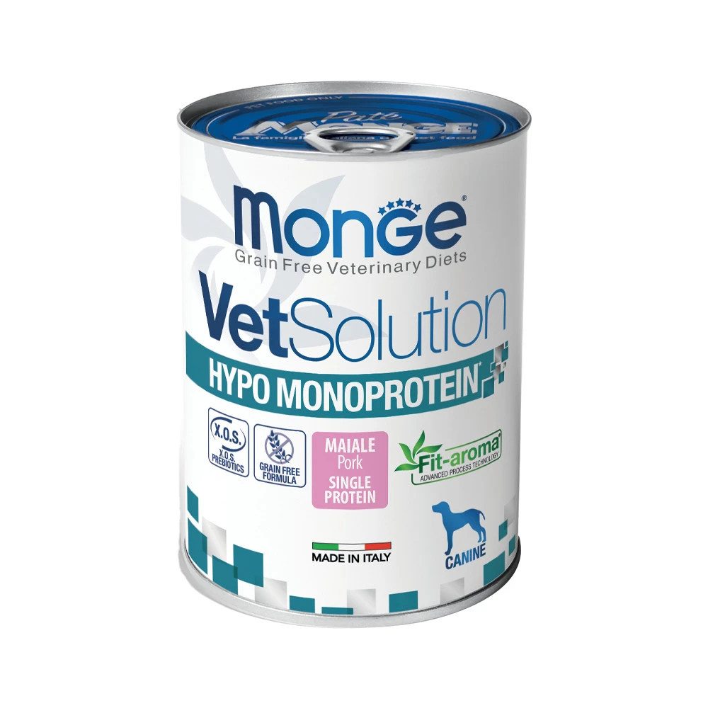 A Monge VetSolution Hypo Monoprotein Pork egy teljes értékű diétás állateledel kutyák számára, amelynek összetételét úgy alakították ki, hogy csökkenti az összetevők és tápanyagok intoleranciáját. Nukleotidokat tartalmaz a bőr regenerálódásának elősegítésére, aloe vera a bőr támogatására, xilo-oligoszacharidokat (XOS) a bélflóra védelmére.
