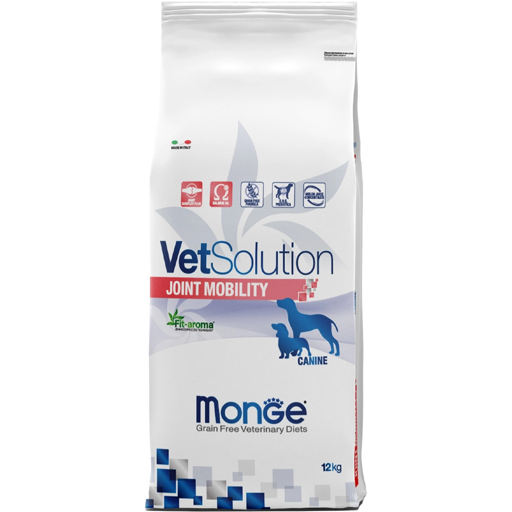A Monge VetSolution Joint Mobility Canine egy teljes értékű diétás táplálék kutyák számára, amely az ízületek anyagcseréjének támogatására lett kifejlesztve osteoarthritis esetén. Tartalmaz dinnye koncentrátumot a szabad gyökök semlegesítésére, Boswellia serrata-t az ízületek támogatására és xilooligoszacharidokat a bélflóra védelmére. A készítmény teljes omega-3 zsírsavakkal és eikozapentaénsavval, valamint megfelelő mennyiségű E-vitaminnal rendelkezik.