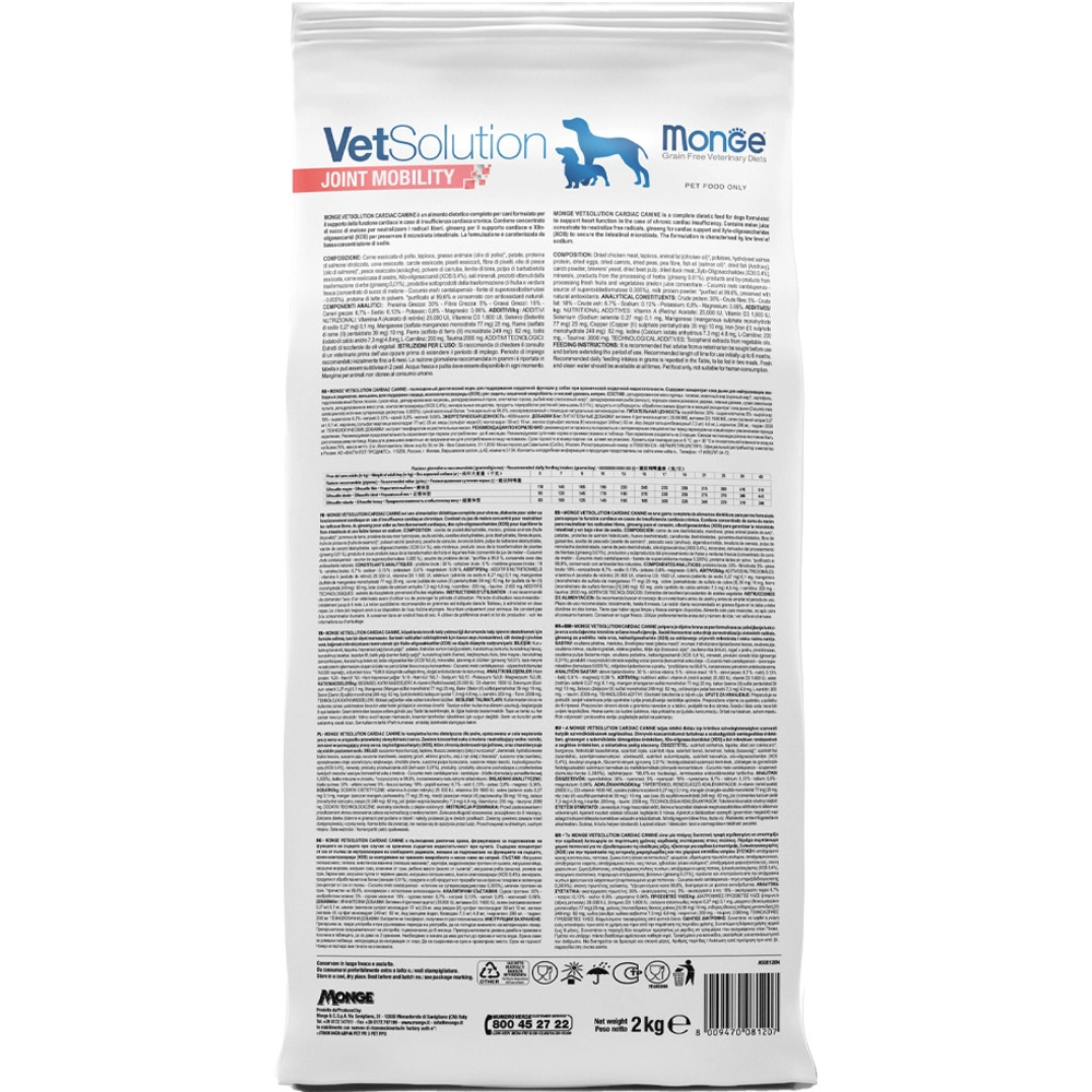 A Monge VetSolution Joint Mobility Canine egy teljes értékű diétás táplálék kutyák számára, amely az ízületek anyagcseréjének támogatására lett kifejlesztve osteoarthritis esetén. Tartalmaz dinnye koncentrátumot a szabad gyökök semlegesítésére, Boswellia serrata-t az ízületek támogatására és xilooligoszacharidokat a bélflóra védelmére. A készítmény teljes omega-3 zsírsavakkal és eikozapentaénsavval, valamint megfelelő mennyiségű E-vitaminnal rendelkezik.