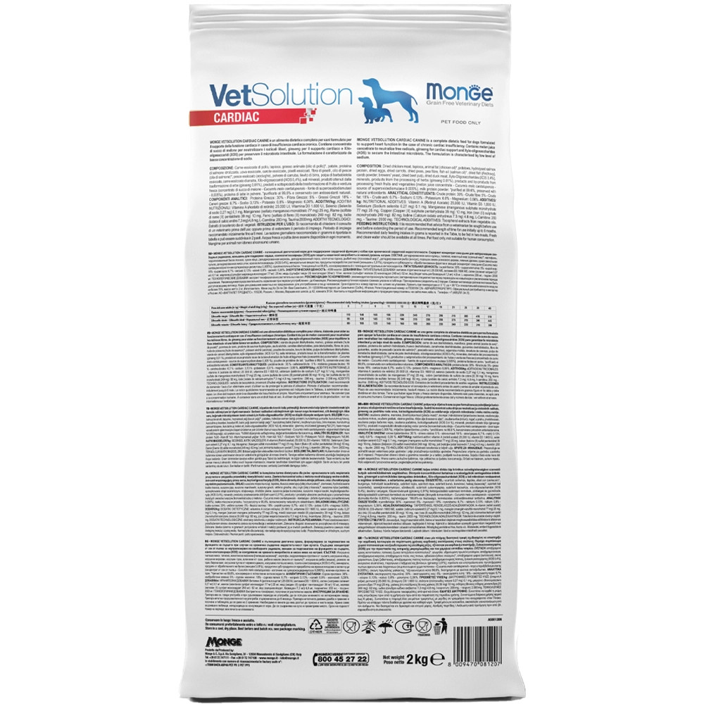 A Monge VetSolution Cardiac Canine egy teljes értékű diétás táplálék kutyák számára, amely krónikus szívelégtelenség esetén támogatja a szív működését. Tartalmaz dinnye koncentrátumot a szabad gyökök semlegesítésére, ginsenget a szív működésének támogatására és xilo-oligoszacharidokat (XOS) a bélflóra védelmére. A készítmény alacsony nátriumtartalommal rendelkezik.