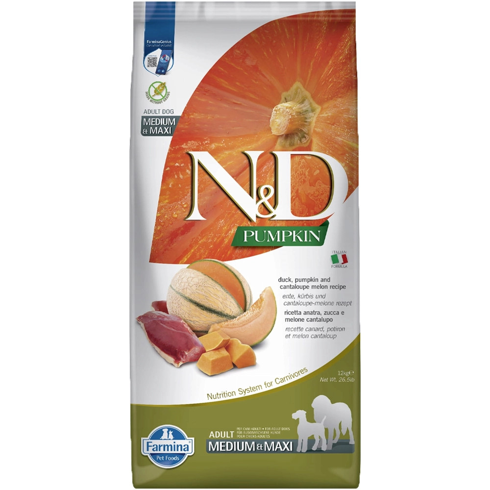 N&D Pumpkin Medium & Maxi Adult Gabonamentes Száraz Kutyatáp (Kacsa, Sütőtök és Sárgadinnye) Gabonamentes eledel kacsával, sütőtökkel és sárgadinnyével felnőtt, közepes és nagytestű kutyákszámára.Összetétel: Kacsa (24%), dehidratált kacsafehérje (22%), batátyu, csirkezsír, szárított füst (5%), szárított tojás, hering, szárított heringfehérje, halolaj (hering), borsó gyapjúkönyv, szárított húsosor, szárított lucerna, inulin, fruktooligoszacharidok, élesztőkivonat (mannánoligoszacharidok), szárított sárgadinnye (0,5%), szárított alma, szárított hab, psylliumhéjmag (0,3%), szárított édes narancs, szárított fenyőbogyó, nátrium-klorid, szárított élesztő, kurkuma (0,2%), glükozamin, kondroitin-szulfátAnalitikai összetevők: Nyersfehérje:30,00%, nyerszsír:18,00%, nyersrost:2,90%, nedvesség:9,00%, nyershamu:7,30%, Vápník:0,90%, foszfor:0,80%, Omega-6:3,30%, Omega-3:0,90%, DHA:0,5 0%, EPA:0,30%, Glükozamin:1200mg/kg, Kondroitin-szulfát:900mg/kg Táplálkozási adalékanyagok/kg: A-vitamin:15000IU, D3-vitamin:1500IU, E-vitamin:600mg, C-vitamin:150mg, niacin:37,5mg, kalcium-D-pantotenát:15mg, B2-vitamin:7,5mg, B6-vitamin:6mg, B1-vitamin:4,5mg, biotin:0,38mg, folsav:0,45mg, B12-vitamin:0,1mg, kolin-klorid:2500mg, béta-karotin:1,5mg, (hidroxi-metionin-analóg kelát):163,8mg, Mangán (mangán-kelát hidroximetionin-analóg):64,6 mg, Vas (vas(II) kelátos formája, hidrát):58,3 mg, Réz (réz kelát hidroxi-metionin analóg):58,3 mg, szelén (szelénnel dúsított inaktivált élesztő): 15,8 mg, DL-metionin technikailag tiszta:4000 mg, taurin:1000 mg, L-karnitin:300 mgÉrzékszervi adalékanyagok: Zöld tea kivonat:100mg, rozmaring kivonatAntioxidánsok: Növényi olajokból származó tokoferol kivonatok