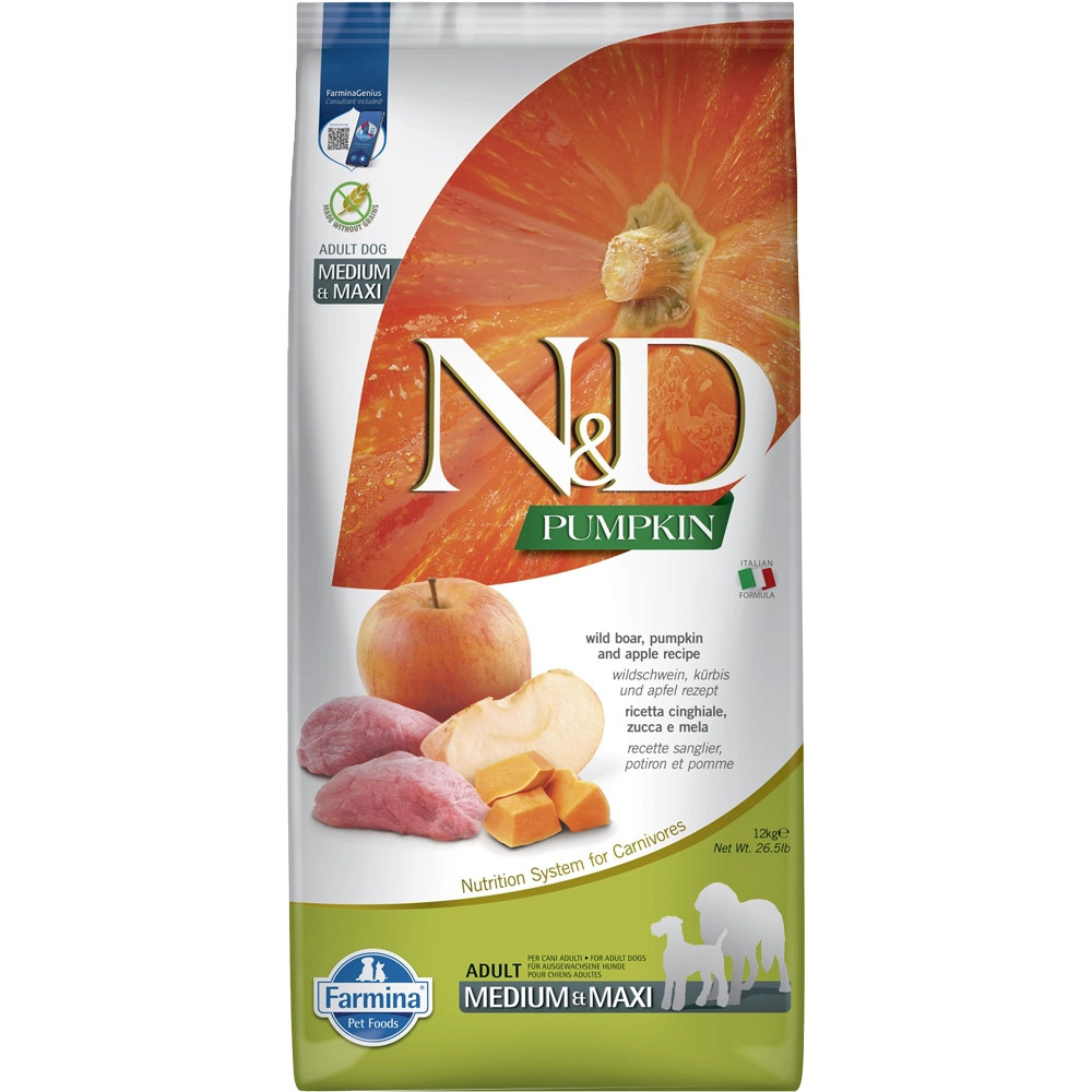 N&D Pumpkin Medium & Maxi Adult Gabonamentes Száraz Kutyatáp (Vaddisznó, Alma és Sütőtök) N&D Sütőtökkel - Vaddisznó, sütőtök és alma receptúra. Teljes értékű száraz eledel, kistestű felnőtt kutyák részére.Összetevők: Vaddisznó (24%), dehidratált vaddisznófehérje (22%), borsó keményítő, csirkezsír, sütőtök (5%), szárított tojás, halolaj (heringből), borsórost, szárított sárgarépa, lucernaliszt, inulin, frukto-oligoszacharidok, élesztő kivonat (manno-oligoszacharidok forrása), szárított alma (0,5%), szárított spenót, útifűmaghéj (0,3%), szárított gránátalma, szárított édesnarancs, szárított áfonya, nátrium-klorid, szárított sörélesztő, kurkuma (0,2%), aloe vera kivonat, glükozamin, kondroitin-szulfátAnalitikai összetevők: Nyersfehérje:30,00%, nyerszsír:18,00%, nyersrost:2,90%, nedvesség:9,00%, nyershamu:6,60%, kalcium:0,90%, foszfor:0,70%, Omega-6:3,30%, Omega-3:0,90%, DHA:0,50%, EPA:0,30%, glükozamin:1200mg/kg, kondroitin-szulfát:900mg/kgTáplálkozási adalékanyagok/kg: A-vitamin:15000NE, D3-vitamin:1500NE, E-vitamin:600mg, C-vitamin:150mg, niacin:37,5mg, kalcium-D-pantotenát:15mg, B2-vitamin:7,5mg, B6-vitamin:6mg, B1-vitamin:4,5mg, biotin:0,38mg, folsav:0,45mg, B12-vitamin:0,1mg, kolin-klorid:2500mg, béta-karotin:1,5mg, Cink (metionin-hidroxi-analóg cinkkelátja):163,8mg, Mangan (metionin-hidroxi-analóg mangánkelátja):64,6mg, Vas (glicin-hidrát vas (II)-kelátja):58,3mg, Réz (metionin-hidroxi-analóg rézkelátja):15,8mg, Szelén (szeléntartalmú inaktivált élesztő):0,00088mg, DL-metionin ipari tisztaságú:4000mg, taurin:1000mg, L-karnitin:300mgÉrzékszervi adalékanyagok: Zöldtea kivonat 100mg, rozmaring kivonatAntioxidánsok: Növényi olajokból származó tokoferol kivonatokEnergia érték: EM Kcal/Kg 4005 - Mj/Kg 16,75