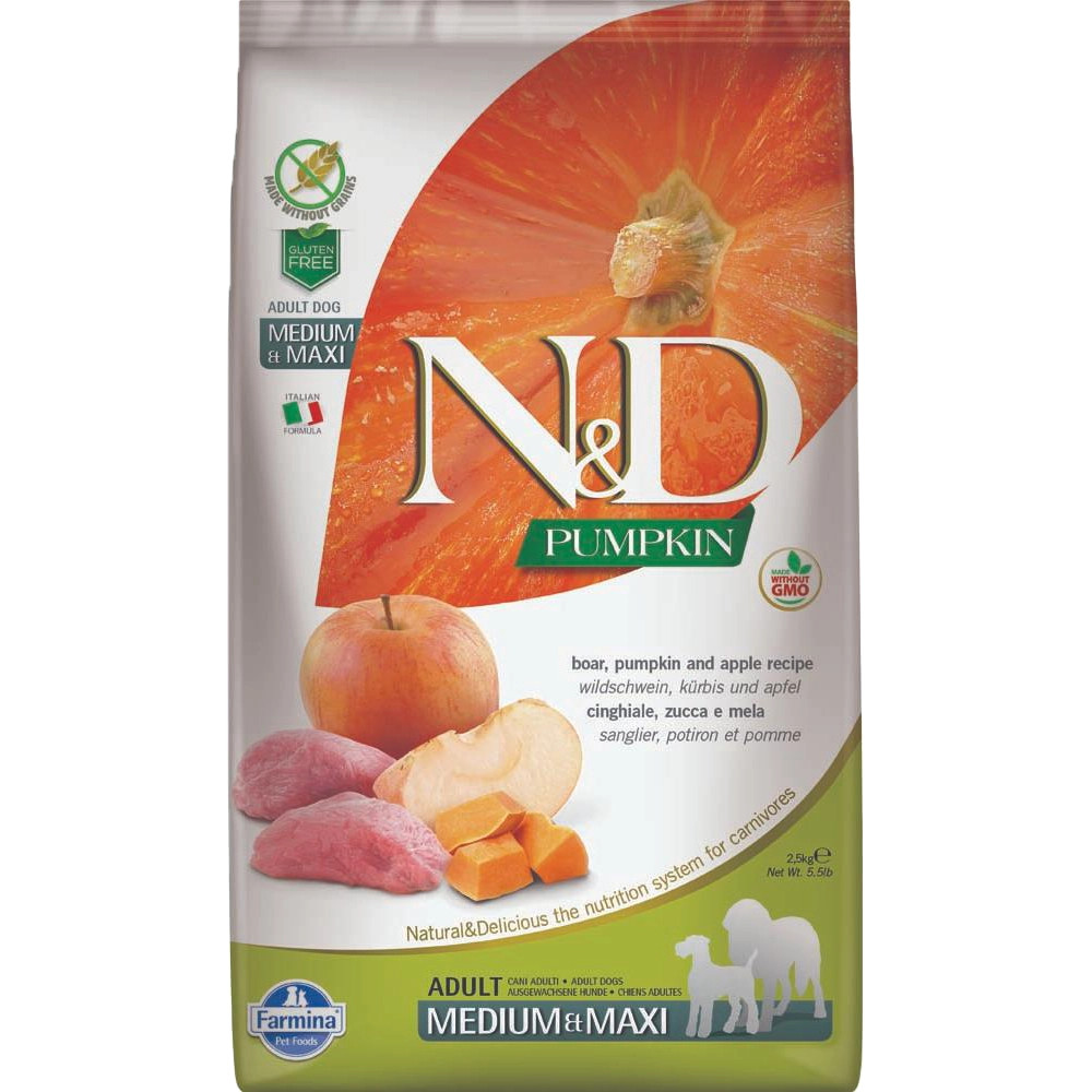 N&D Pumpkin Medium & Maxi Adult Gabonamentes Száraz Kutyatáp (Vaddisznó, Alma és Sütőtök) N&D Sütőtökkel - Vaddisznó, sütőtök és alma receptúra. Teljes értékű száraz eledel, kistestű felnőtt kutyák részére.Összetevők: Vaddisznó (24%), dehidratált vaddisznófehérje (22%), borsó keményítő, csirkezsír, sütőtök (5%), szárított tojás, halolaj (heringből), borsórost, szárított sárgarépa, lucernaliszt, inulin, frukto-oligoszacharidok, élesztő kivonat (manno-oligoszacharidok forrása), szárított alma (0,5%), szárított spenót, útifűmaghéj (0,3%), szárított gránátalma, szárított édesnarancs, szárított áfonya, nátrium-klorid, szárított sörélesztő, kurkuma (0,2%), aloe vera kivonat, glükozamin, kondroitin-szulfátAnalitikai összetevők: Nyersfehérje:30,00%, nyerszsír:18,00%, nyersrost:2,90%, nedvesség:9,00%, nyershamu:6,60%, kalcium:0,90%, foszfor:0,70%, Omega-6:3,30%, Omega-3:0,90%, DHA:0,50%, EPA:0,30%, glükozamin:1200mg/kg, kondroitin-szulfát:900mg/kgTáplálkozási adalékanyagok/kg: A-vitamin:15000NE, D3-vitamin:1500NE, E-vitamin:600mg, C-vitamin:150mg, niacin:37,5mg, kalcium-D-pantotenát:15mg, B2-vitamin:7,5mg, B6-vitamin:6mg, B1-vitamin:4,5mg, biotin:0,38mg, folsav:0,45mg, B12-vitamin:0,1mg, kolin-klorid:2500mg, béta-karotin:1,5mg, Cink (metionin-hidroxi-analóg cinkkelátja):163,8mg, Mangan (metionin-hidroxi-analóg mangánkelátja):64,6mg, Vas (glicin-hidrát vas (II)-kelátja):58,3mg, Réz (metionin-hidroxi-analóg rézkelátja):15,8mg, Szelén (szeléntartalmú inaktivált élesztő):0,00088mg, DL-metionin ipari tisztaságú:4000mg, taurin:1000mg, L-karnitin:300mgÉrzékszervi adalékanyagok: Zöldtea kivonat 100mg, rozmaring kivonatAntioxidánsok: Növényi olajokból származó tokoferol kivonatokEnergia érték: EM Kcal/Kg 4005 - Mj/Kg 16,75