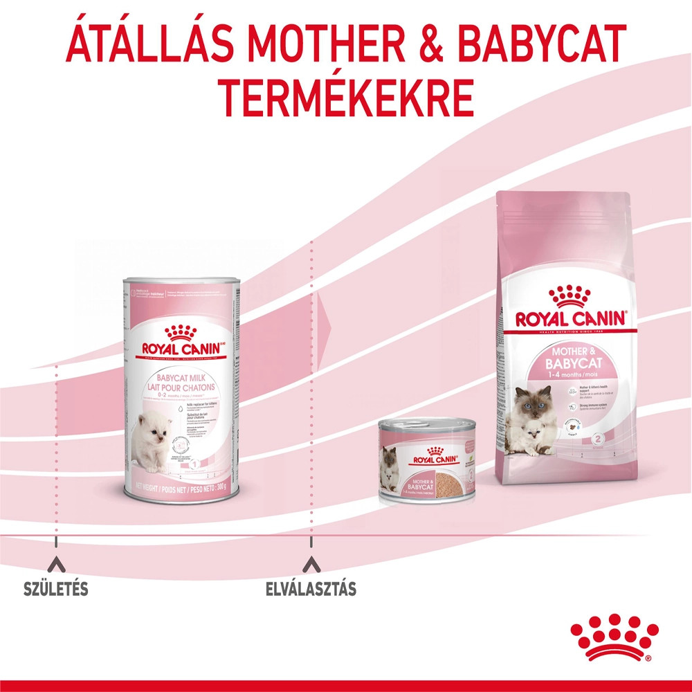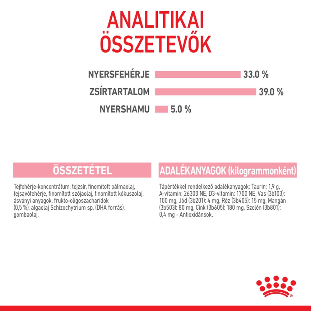 Royal Canin Babycat Milk • Tejpótló kölyökmacskák számára• Az agy fejlődése DHA támogatásával• Az immunrendszer egészsége • Mikrobiom támogatásA ROYAL CANIN Babycat Milk tejpótlót kifejezetten kölyökmacskák táplálására fejlesztettük ki, arra az esetre, ha az anyatej nem elegendő vagy nem megfelelő minőségű. A tejpótló összetétele a lehető legjobban hasonlít az anyamacska tejéhez, amely sok természetes zsírsavat tartalmaz.A termék kiválóan alkalmas a kölyökmacskák számára életük első szakaszában, a születéstől az elválasztásig.A prebiotikumok és a kitűnően emészthető fehérjék kombinációja támogatja a bélmikrobióta egészséges egyensúlyát az egészséges emésztés érdekében. A tejpótló összetétele különösen megfelelő a kölyökmacskák fejletlen emésztőrendszerének, elősegíti a növekedést és az egészséges emésztést, valamint laktóztartalma az igényeikhez igazított, keményítőt pedig nem tartalmaz.Összetételének köszönhetően a Babycat Milk egyszerűen elkészíthető: azonnal oldódik, így teljesen homogén állagú tejpótlót kapunk.A kölyökmacska természetes védekezőrendszere és idegrendszere a születés után folyamatosan fejlődik. A ROYAL CANIN Babycat Milk omega-3 esszenciális zsírsavat (DHA) tartalmaz. Az anyatejben természetes módon jelen lévő DHA támogatja a kölyökmacska agyának fejlődését.Javasoljuk, hogy olvassa el a csomagoláson található etetési útmutatót és győződjön meg arról, hogy az optimális támogatás érdekében kölyökmacskája a megfelelő mennyiséget kapja.Valamennyi termékünk esetén széles körű minőség-ellenőrzést végzünk, biztosítva, hogy a ROYAL CANIN Babycat Milk fogyasztása teljes értékű és kiegyensúlyozott táplálékot nyújtson kölyökmacskája számára, támogatva az egészséges növekedését.Összetétel: Tejfehérjék, tejzsír, növényi olajok (arachidonsavban gazdag olajat tartalmaz), tejsavó fehérje, halolaj (DHA forrás), ásványi sók, frukto-oligoszacharidokAnalitikai összetevők: Nyersfehérje: 33%, Nyersolajok és -zsírok: 39%, Nyershamu: 6%, DHA: 1 g/kgTáplálkozási adalékanyagok/kg: A vitamin: 25000 NE, D3 vitamin: 1500 NE, E1 (Vas): 100 mg, E2 (Jód): 4 mg, E4 (Réz): 15 mg, E5 (Mangán): 80 mg, E6 (Cink): 230 mg, E8 (Szelén): 0,43 mg, Taurin: 2,5 g, Antioxidánsok