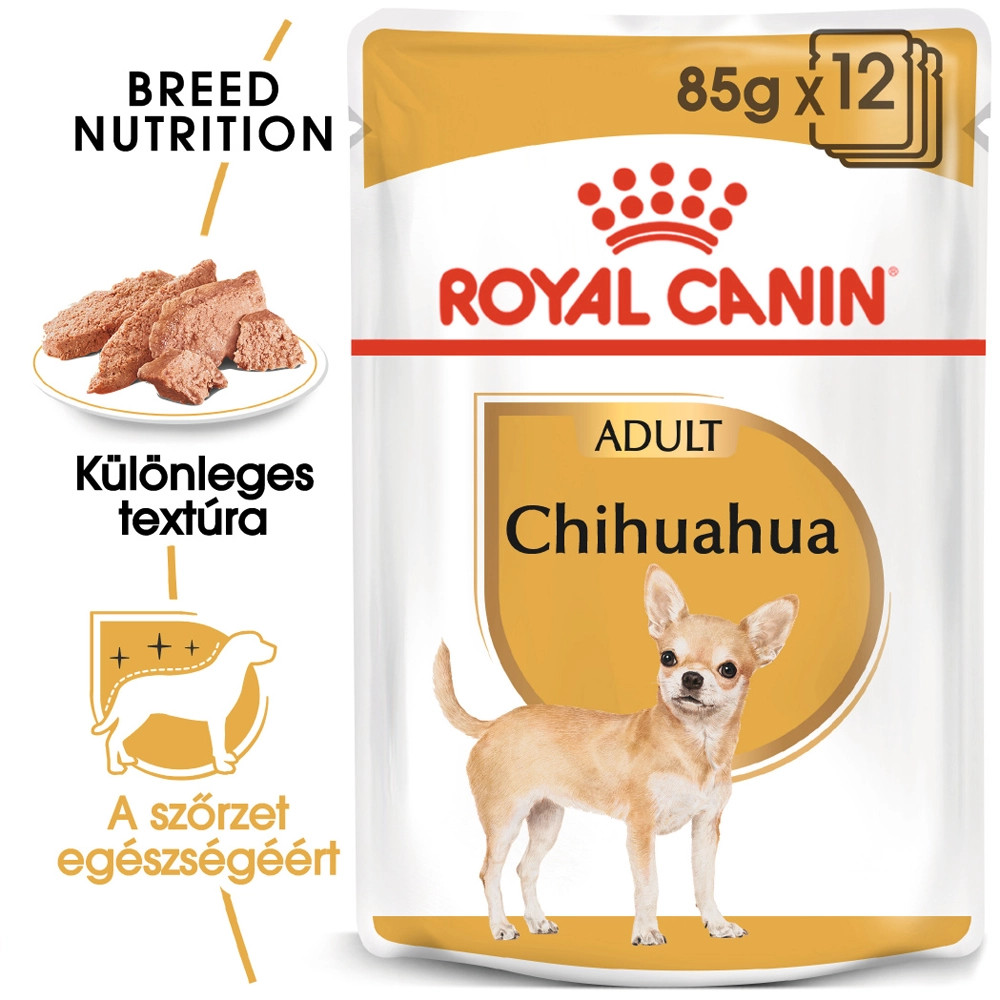 A ROYAL CANIN Chihuahua in Loaf (pástétom formájú) tápot úgy állították össze, hogy támogassa a kutya egészséges bélpasszázsát. Olyan tápanyagokat is tartalmaz, amelyek támogatják a bőr és a szőrzet egészségének megőrzését.
