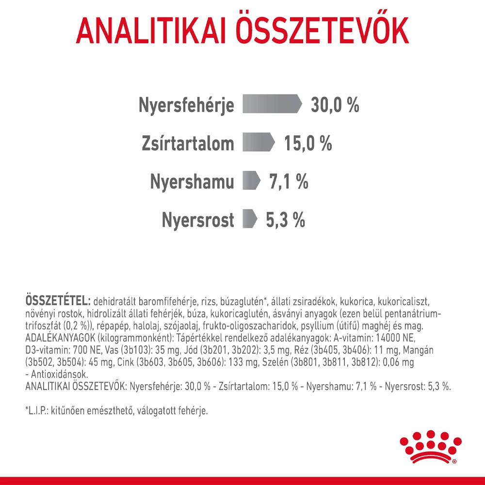 Royal Canin Dental Care Száraz Macskatáp• Segít csökkenteni a fogkőképződést• Speciális fogkefeszerű hatás• Igazolt eredményekMacskája étrendje fontos szerepet játszik az egészségében. A ROYAL CANIN Feline Care Nutrition termékcsalád olyan speciálisan összeállított tápokat tartalmaz, amelyeket a macskája által esetlegesen tapasztalt leggyakoribb érzékenységek kezelésére fejlesztettek ki.Evés után az ételmaradékok vékony lepedékréteget képeznek a fogakon. Idővel a lepedék megkeményedhet, és fogkövet képezhet, amely kezelés nélkül fogászati problémákhoz vezethet.A ROYAL CANIN Dental Care táplálkozási szempontból teljes értékű és kiegyensúlyozott összetételét kifejezetten úgy tervezték, hogy támogassa macskája fogainak egészségét és szájhigiéniáját.A ROYAL CANIN Dental Care száraz eledel fogászati hatóanyaggal van ellátva, amely megköti a macska nyálában lévő kalciumot, így segít csökkenteni a fogkő kialakulását és felhalmozódását.Sőt, a táp speciálisan kialakított, sajátos textúrájú tápszemcséi minden egyes falat megrágásával segítik a macska fogainak ápolását. Ez a fogtisztító hatás segít korlátozni a káros lepedék és fogkő felhalmozódását minden táplálkozás során.A táp ezenkívül kiegyensúlyozott arányban ásványi anyagokat is tartalmaz, hogy segítsen fenntartani felnőtt macskája húgyutainak egészséges működését.A ROYAL CANIN Dental Care igazolt eredményekkel rendelkezik. Tanulmányunk* kimutatta, hogy a táp mindössze 28 nap alatt jelentősen, akár 59%-kal csökkentette a fogkőképződést a résztvevő macskák fogain.Minden ROYAL CANIN termék kiterjedt minőség-ellenőrzési folyamaton megy keresztül, hogy a legjobb minőségű eledeleket garantáljuk. Ha macskája a ROYAL CANIN Dental Care tápot fogyasztja, teljes értékű és kiegyensúlyozott táplálékot kap.*A Royal Canin belső tanulmányaÖsszetétel: Dehidratált baromfifehérje, rizs, búzaglutén*, állati zsiradékok, kukorica, kukoricaliszt, növényi rostok, hidrolizált állati fehérjék, búza, kukoricaglutén, ásványi anyagok (ezen belül pentanátrium-trifoszfát (0,2 %)), répapép, halolaj, szójaolaj, frukto-oligoszacharidok, psyllium (útifű) maghéj és mag*L.I.P.: kitűnően emészthető, válogatott fehérjeAnalitikai összetevők: Nyersfehérje: 30,0 %, Zsírtartalom: 15,0 %, Nyershamu: 7,1 %, Nyersrost: 5,3 %Tápértékkel rendelkező adalékanyagok/kg: A-vitamin: 14000 NE, D3-vitamin: 700 NE, Vas (3b103): 35 mg, Jód (3b201, 3b202): 3,5 mg, Réz (3b405, 3b406): 11 mg, Mangán (3b502, 3b504): 45 mg, Cink (3b603, 3b605, 3b606): 133 mg, Szelén (3b801, 3b811, 3b812): 0,06 mg, Antioxidánsok