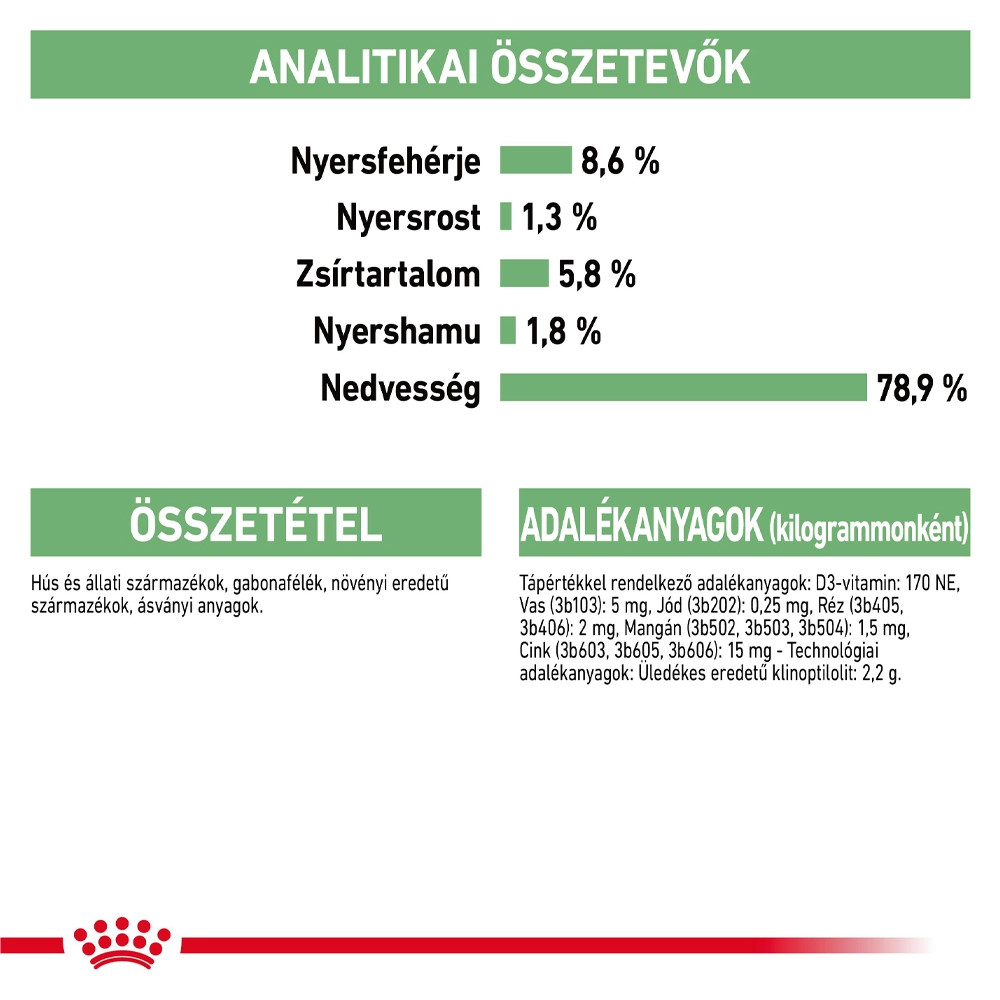 Royal Canin Digestive Care Alutasakos Kutyaeledel • Támogatja az egészséges emésztést• Canine Care Nutrition (CCN) programAz emésztési zavarok senki számára sem kellemesek, az Ön kutyatársát is beleértve. Egy kitűnő minőségű tápanyagokat tartalmazó táp a bélkomfort mellett a kutya általános jóllétéhez is hozzájárul.A ROYAL CANIN Digestive Care Loaf (pástétom) minden testméretű kutya számára alkalmas.A Royal Canin kenneljeiben tesztelt ROYAL CANIN Digestive Care Loaf kitűnően emészthető fehérjék mellett a kiegyensúlyozott bélflóra fenntartásához szükséges prebiotikumok és rostok keverékét is tartalmazza – ami végső soron elősegíti az optimális bélsárminőség elérését.A Royal Canin nagyon komolyan veszi a fehérjéket, ezért mi csak a legkiválóbb minőségű fehérjéket használjuk, és a típusát pontosan a kutya tényleges igényeihez igazítjuk. A ROYAL CANIN Digestive Care Loaf formula kitűnően emészthető – L.I.P. néven is ismert – fehérjéket, valamint az egészséges bélflóra fenntartásához szükséges prebiotikumokat tartalmaz.Mi több, a ROYAL CANIN Digestive Care Loaf formula az oldható és oldhatatlan rostok pontosan kiegyensúlyozott keverékét is tartalmazza az erjedés csökkentése és az egészséges bélpasszázs elősegítése érdekében.E finom pástétom mellett a Digestive Care táplálási programunk egy ropogós tápszemcsékből álló száraz táp formájában is hozzáférhető. Mindkét komponens teljes tápértékű, és tökéletesen kiegészítik egymást. Miért ne próbálná ki a pástétomot a száraz táphoz adott ízletes „feltétként”?Váltson a ROYAL CANIN Digestive Care táplálási programra és tapasztalja meg az optimális bélkomfort és jobb bélbeli felszívódás érdekében gondosan beállított összetételű, kitűnő minőségű tápanyagok előnyeit!Összetétel: Hús és állati származékok, gabonafélék, növényi eredetű származékok, ásványi anyagokAnalitikai összetevők: Nyersfehérje: 8,6 %, Nyersrost: 1,3 %, Zsírtartalom: 5,8 %, Nyershamu: 1,8 %, Nedvesség: 78,9 %Tápértékkel rendelkező adalékanyagok/kg: D3-vitamin: 170 NE, Vas (3b103): 5 mg, Jód (3b202): 0,25 mg, Réz (3b405, 3b406): 2 mg, Mangán (3b502, 3b503, 3b504): 1,5 mg, Cink (3b603, 3b605, 3b606): 15 mgTechnológiai adalékanyagok/kg: Üledékes eredetű klinoptilolit: 2,2 g