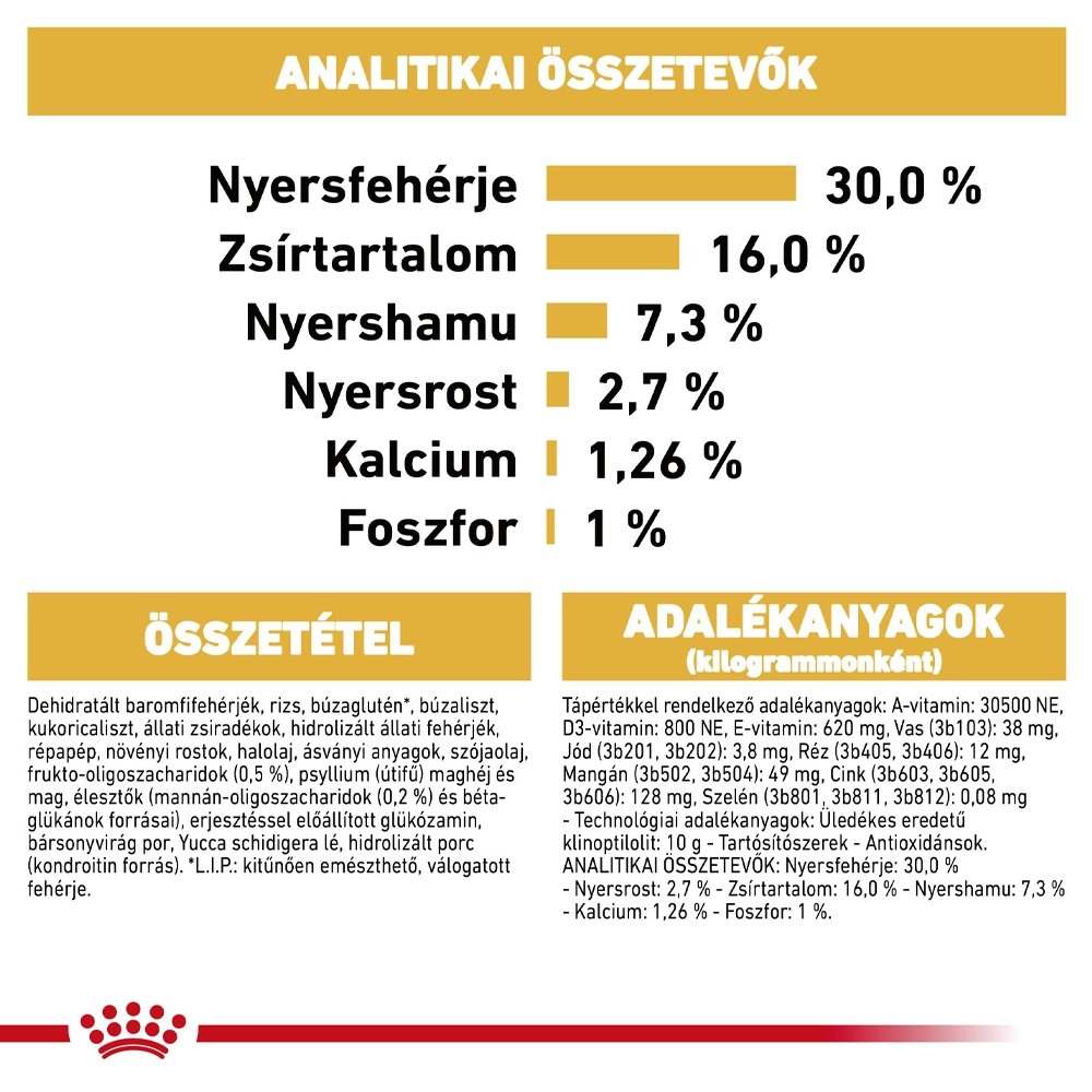 Royal Canin German Shepherd Puppy Száraz Kutyatáp • Az immunrendszer támogatása• Egészséges emésztés• Egészséges csontok és ízületekA németjuhász kölyökkutyák számára 15 hónapos korig alkalmas ROYAL CANIN German Shepherd Puppy kifejezetten úgy van összeállítva, hogy kielégítse a fiatal németjuhász kölyökkutya minden tápanyagigényét.A németjuhász egy szilárd felépítésű, nagytestű kutya. E kutyák felnőttkorukat elérve általában erősek, izmosak és soványak. Ezért fontos biztosítani, hogy kölyökkorban minden olyan tápanyaghoz hozzájussanak, amelyek szükségesek a korai életszakaszokban való növekedés támogatásához.A növekedés periódusa a kutya életének kulcsfontosságú szakasza: a nagy változások, a felfedezések és az új találkozások ideje. E kulcsfontosságú időszakban a kölyökkutya immunrendszere fokozatosan fejlődik.A ROYAL CANIN German Shepherd Puppy táp erősíti a kölyökkutya természetes védekező rendszerét, különösen annak köszönhetően, hogy egy szabadalmazott antioxidáns komplexet – benne E-vitamint – tartalmaz.A ROYAL CANIN German Shepherd Puppy táp az emésztőrendszer optimális egészségét támogató tápanyagok kiegyensúlyozott kombinációját tartalmazza, köztük a kifejezetten a kitűnő emészthetősége miatt kiválasztott fehérjét. E formula segít fenntartani a bélflóra egészséges egyensúlyát, ezáltal hozzájárul a bélsár jó minőségéhez.Gondosan beállított kalcium- és foszfortartalmának köszönhetően a ROYAL CANIN German Shepherd Puppy segít egészségesen és erősen tartani a csontokat és az ízületeket. Ez a különleges formula emellett az ideális testsúly fenntartásához is hozzájárul.A ROYAL CANIN German Shepherd Puppy rendkívül ízletes tápszemcséjének alakja és mérete kifejezetten a németjuhász kölyök állkapcsának megfelelően van kialakítva.A ROYAL CANIN-nál mi elkötelezettek vagyunk amellett, hogy a kedvenc szükségleteinek megfelelő táplálási megoldásokat nyújtsunk. Minden termékünk átfogó minőségellenőrzési eljáráson esik át az optimális minőség biztosítása, illetve a kölyökkutya különleges diétás igényeinek és életmódjának való megfelelés érdekében. Ez azt jelenti, hogy az Ön ROYAL CANIN German Shepherd Puppy tápot fogyasztó kölyökkutyája egy teljes értékű és kiegyensúlyozott tápot kap.Összetétel: Dehidratált baromfifehérjék, rizs, búzaglutén*, búzaliszt, kukoricaliszt, állati zsiradékok, hidrolizált állati fehérjék, répapép, növényi rostok, halolaj, ásványi anyagok, szójaolaj, frukto-oligoszacharidok (0,5 %), psyllium (útifű) maghéj és mag, élesztők (mannán-oligoszacharidok (0,2 %) és béta-glükánok forrásai), erjesztéssel előállított glükózamin, bársonyvirág por, Yucca schidigera lé, hidrolizált porc (kondroitin forrás)*L.I.P.: kitűnően emészthető, válogatott fehérjeAnalitikai összetevők: Nyersfehérje: 30,0 %, Nyersrost: 2,7 %, Zsírtartalom: 16,0 %, Nyershamu: 7,3 %, Kalcium: 1,26 %, Foszfor: 1 %Technológiai adalékanyagok/kg: A-vitamin: 30500 NE, D3-vitamin: 800 NE, E-vitamin: 620 mg, Vas (3b103): 38 mg, Jód (3b201, 3b202): 3,8 mg, Réz (3b405, 3b406): 12 mg, Mangán (3b502, 3b504): 49 mg, Cink (3b603, 3b605, 3b606): 128 mg, Szelén (3b801, 3b811, 3b812): 0,08 mTechnológiai adalékanyagok/kg: Üledékes eredetű klinoptilolit: 10 g, Tartósítószerek, Antioxidánsok