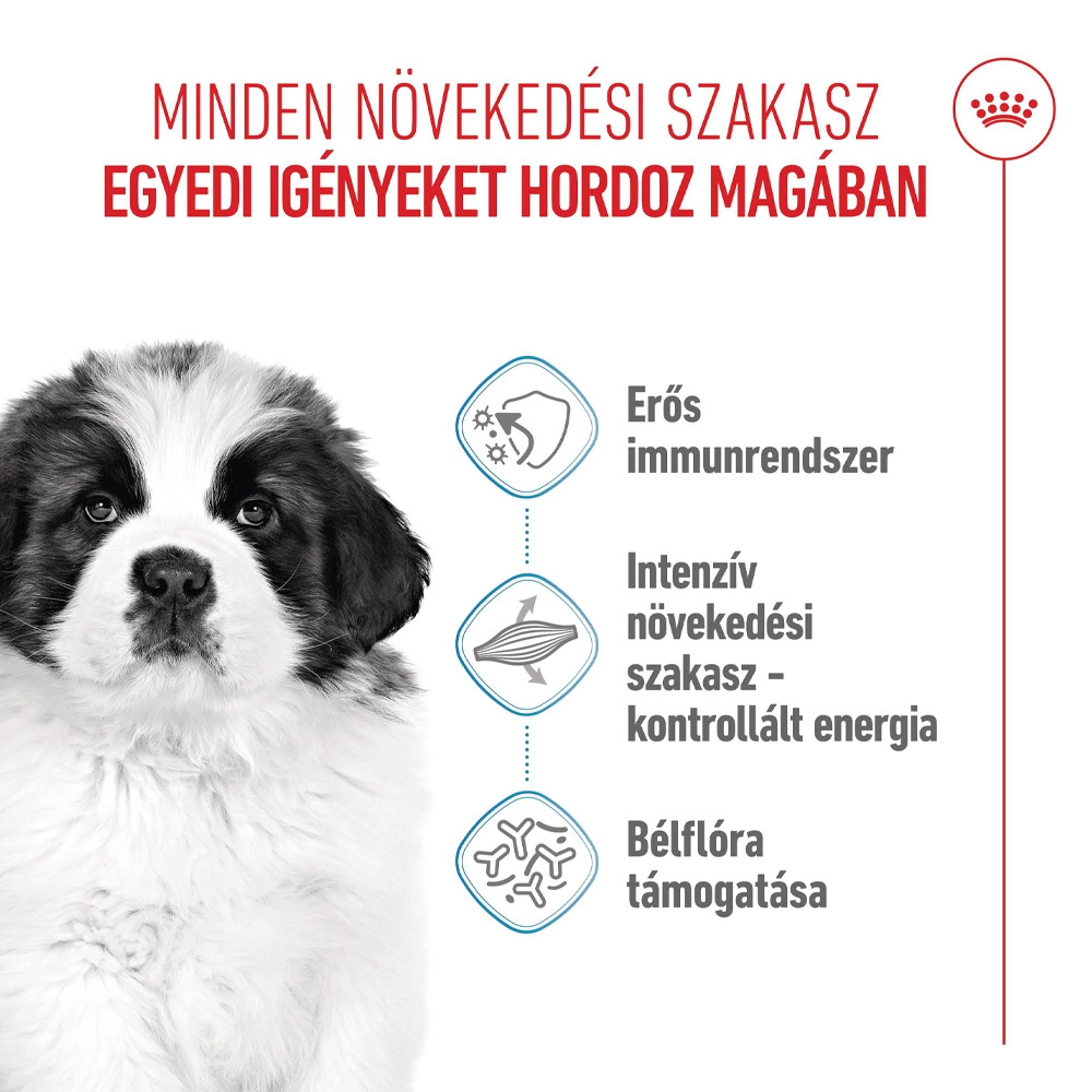 Az óriástestű kutyák körülbelül 18-24 hónap alatt érik el 45+ kg-os felnőttkori testtömegüket. Ez alatt az idő alatt tápanyagszükségletük változik, ezért kétféle étrendet fejlesztettünk ki: ROYAL CANIN Giant Puppy, amelyet 2 és 8 hónapos kor között javasolt adni, valamint a ROYAL CANIN Giant Junior, amelyet 8 és 18/24 hónapos kor között lehet etetni.