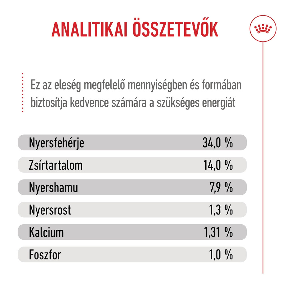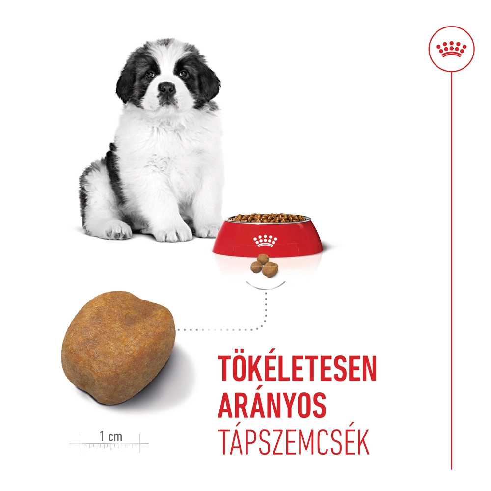 Royal Canin Giant Puppy (>45 kg) Száraz Kutyatáp • Intenzív növekedéshez megfelelő energia• Erős immunrendszer• Mikrobiom támogatása• A csontok és az ízületek támogatásaAz óriástestű kutyák körülbelül 18-24 hónap alatt érik el 45+ kg-os felnőttkori testtömegüket. Ez alatt az idő alatt tápanyagszükségletük változik, ezért kétféle étrendet fejlesztettünk ki: ROYAL CANIN Giant Puppy, amelyet 2 és 8 hónapos kor között javasolt adni, valamint a ROYAL CANIN Giant Junior, amelyet 8 és 18/24 hónapos kor között lehet etetni. Óriástestű kölyökkutyája intenzív növekedési szakasza során elegendő kalóriára és megfelelő tápanyagokra van szüksége az egészséges növekedéshez. Ebben a növekedési fázisban fejlődnek ki kölyökkutyája csontjai, izmai, érzékelése és idegrendszere. Ekkora gyengül az anyakutyától származó a kolosztrummal felvett ellenanyagok szintje, ami azt jelenti, hogy a kölyökkutyáknak optimális fehérjemennyiségre van szükségük, hogy kifejlődjön saját immunrendszerük.A ROYAL CANIN Giant Puppy olyan egyedi tápanyagokat tartalmaz, amelyek támogatják óriástestű kölyökkutyája intenzív növekedési szakaszát 2 és 8 hónapos kor között, valamint segítenek elkerülni a túlzott mértékű súlygyarapodást.Olyan tápanyagokat is tartalmaz, mint a C- és E-vitamin, amelyek bizonyítottan támogatják a kölyökkutya egészséges immunrendszerének fejlődését.Az extra nagytestű kutyáknak érzékeny emésztőrendszerük van, és hajlamosak a hasmenésre és a szélszorulásra. A jótékony hatású prebiotikumok (pl. FOS, MOS és cukorrépapép) és kitűnően emészthető fehérjék kombinációjának köszönhetően a bél-mikrobióta (bélflóra) egészséges egyensúlyát is támogatja a megfelelő emésztés érdekében.Továbbá az összetétel az ásványi anyagok precíz szintjét tartalmazza, beleértve a kalciumot és a foszfort az erős, gyorsan növekvő csontok fejlődésének támogatására. A ROYAL CANIN Giant Puppy tápszemcséi kifejezetten kölyökkutyája extra nagy állkapcsához igazodnak, így egyszerű felvenni és elrágni őket.Mire óriástestű junior kutyája eléri a 8 hónapos kort, olyan étrendre van szüksége, amely egyedileg igazított, hogy megfeleljen a tápanyagszükségleteinek a növekedés következő fázisában. Ebben a szakaszban áttérhet a ROYAL CANIN Giant Junior tápra.A Royal Caninnál elkötelezettek vagyunk egy jobb világ megteremtése iránt a macskák és a kutyák számára. Több mint 50 éve dolgozunk szoros együttműködésben tenyésztőkkel, állatorvosokkal és kisállatszakértőkkel, megosztva egymással a szakmai tudást és a tudományos kutatásokat, hogy megteremtsük az egyedi, precíz, tápanyagokkal kapcsolatos megoldásokhoz való elkötelezett hozzáállást.Valamennyi termékünk esetében átfogó minőség-ellenőrzési eljárást folytatunk le, biztosítva az eledelek optimális minőségét. Amikor óriástestű kutyája ROYAL CANIN Giant Puppy tápot eszik, teljes értékű és kiegyensúlyozott táplálékot kap.Összetétel: Dehidratált baromfifehérje, búzaglutén*, rizs, kukorica, kukoricaliszt, állati zsiradékok, búzaliszt, cukorrépapép, hidrolizált állati fehérjék, ásványi sók, kukoricaglutén, szójaolaj, élesztőtermékek, halolaj, frukto-oligoszacharidok, psyllium (útifű) maghéj és mag, hidrolizált élesztő (mannán-oligoszacharidok és béta-glükánok forrása) (0,30 %), algaolaj Schizochytrium sp. (DHA forrás), Yucca schidigera lé, bársonyvirág por, erjesztéssel előállított glükózamin, hidrolizált porc (kondroitin forrás)*L.I.P.: kitűnően emészthető, válogatott fehérjeAnalitikai összetevők: Nyersfehérje: 34,0 %, Zsírtartalom: 14,0 %, Nyershamu: 7,9 %, Nyersrost: 1,3 %, Kalcium: 1,31 %, Foszfor: 1,0 %, E vitamin: 490 mg/kg, C vitamin: 370 mg/kgMetabolizálható energia: 3812 kcal/kgTápértékkel rendelkező adalékanyagok/kg: A vitamin: 16500 NE, D3 vitamin: 1100 NE, Vas (3b103): 36 mg, Jód (3b201, 3b202): 3,6 mg, Réz (3b405, 3b406): 11 mg, Mangán (3b502, 3b504): 47 mg, Cink (3b603, 3b605, 3b606): 128 mg, Szelén (3b801, 3b811, 3b812): 0,05 mgTechnológiai adalékanyagok/kg: Üledékes eredetű klinoptilolit: 10 g, Tartósítószerek, Antioxidánsok