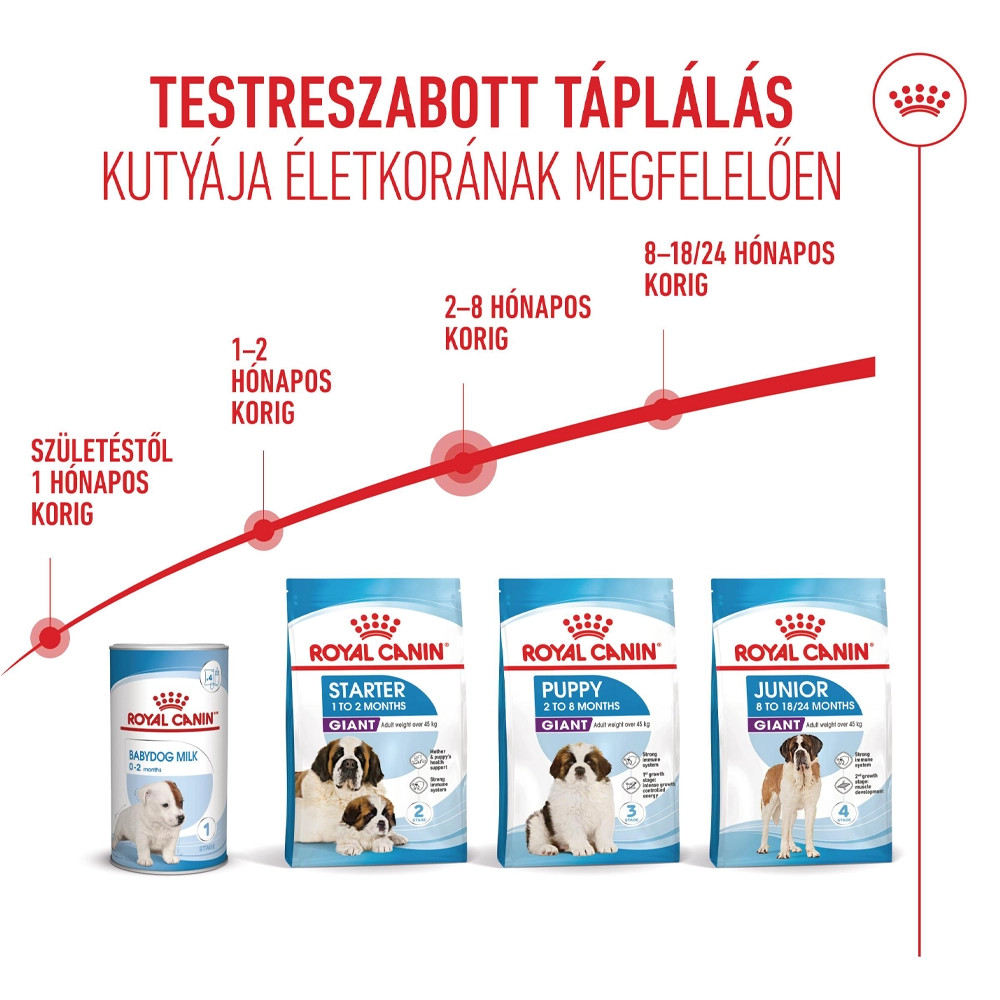 Az óriástestű kutyák körülbelül 18-24 hónap alatt érik el 45+ kg-os felnőttkori testtömegüket. Ez alatt az idő alatt tápanyagszükségletük változik, ezért kétféle étrendet fejlesztettünk ki: ROYAL CANIN Giant Puppy, amelyet 2 és 8 hónapos kor között javasolt adni, valamint a ROYAL CANIN Giant Junior, amelyet 8 és 18/24 hónapos kor között lehet etetni.