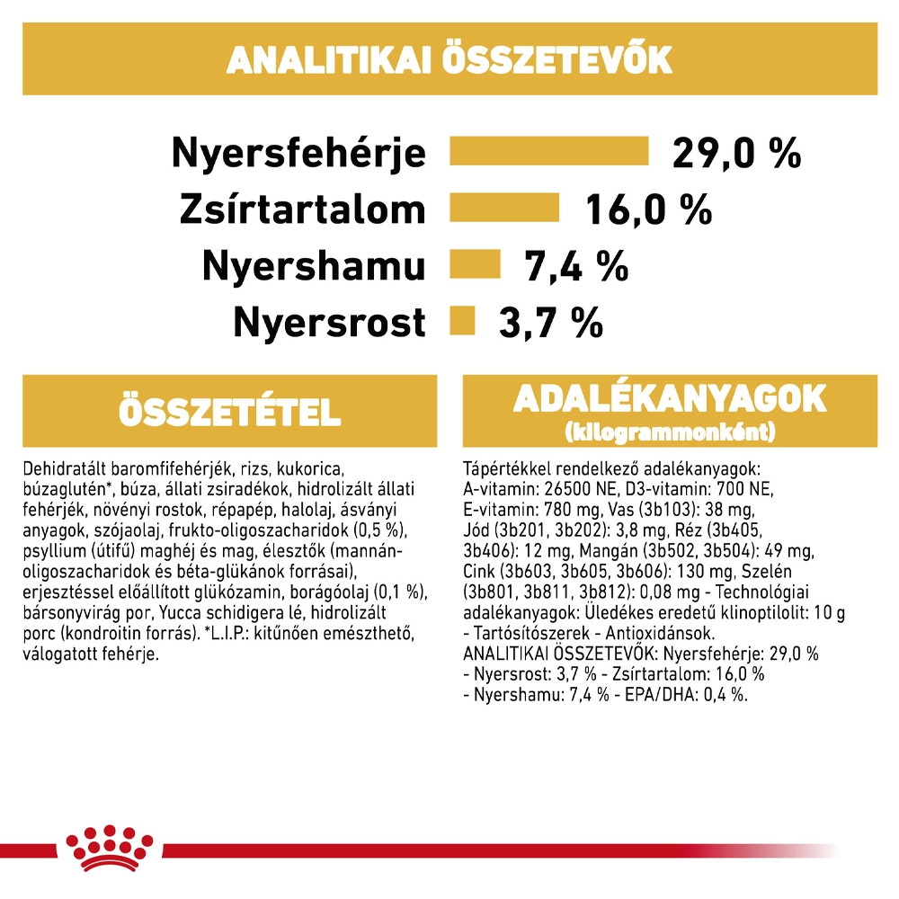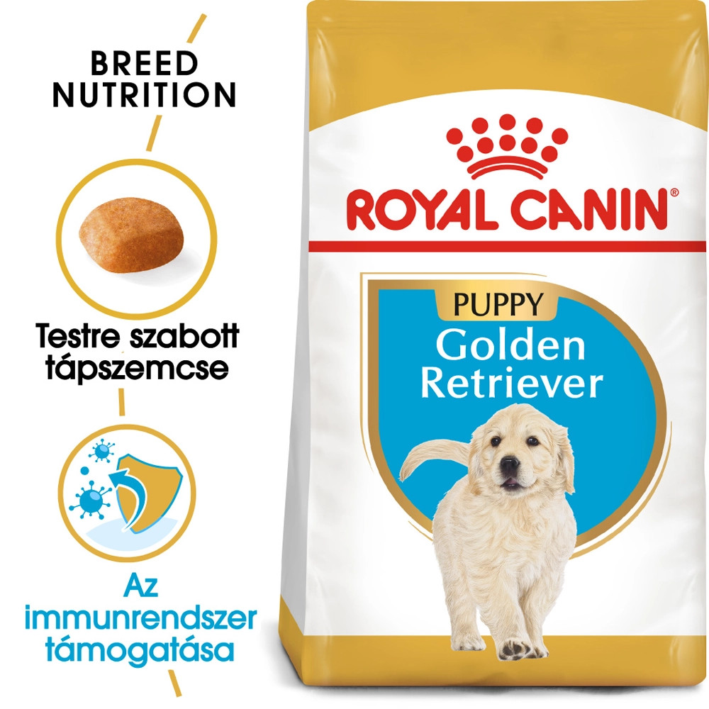 Royal Canin Golden Retriever Puppy Száraz Kutyatáp • Az immunrendszer támogatása• Egészséges bőr és szőrzet • Egészséges emésztésA növekedés időszaka nagyon fontos életszakasz a fiatal Golden Retriever számára: az új felfedezések és a jelentős fizikai változások időszaka. Ezért az Ön kölyökkutyája számára előnyösek lehetnek egyes olyan tápanyagok, melyek kifejezetten támogatják az optimális egészség megőrzését ebben a kulcsfontosságú időszakban.A 15 hónaposnál fiatalabb kölyökkutyák számára alkalmas ROYAL CANIN Golden Retriever Puppy táp kifejezetten úgy van összeállítva, hogy a fiatal Golden Retriever minden tápanyagigényét kielégítse.Ebben a növekedési időszakban a kölyökkutya immunrendszere fokozatosan fejlődik – ezért a ROYAL CANIN Golden Retriever Puppy egy szabadalmazott antioxidáns komplexet – benne E-vitamint – tartalmaz, hogy támogassa a kölyökkutya természetes védekező rendszerét és fenntartsa a kölyök optimális egészségét a növekedés során.A ROYAL CANIN Golden Retriever Puppy táp egy különleges komplexet is tartalmaz, amely segít egészségesen tartani a fiatal retriever bőrét és szőrzetét. Ez az EPA és DHA nevű omega-3 zsírsavakkal és borágó olajjal kiegészített formula erősíti a bőr védvonal funkcióját. A kölyökkutya bőrének egészsége hatással van a szőrzet minőségére is – ezért fontos biztosítani, hogy az Ön kutyája hozzájusson mindazokhoz a tápanyagokhoz, melyekre szüksége van bőre táplálásához és nyugtatásához.A kutya egészséges emésztésének támogatása céljából a ROYAL CANIN Golden Retriever Puppy egy kitűnő minőségű fehérjét és prebiotikumokat is magában foglaló tápanyag-kombinációt tartalmaz. A tápban lévő kitűnő minőségű fehérjét (L.I.P.) kifejezetten a kitűnő emészthetősége miatt választották ki. Ez a formula segít fenntartani a bélflóra egészséges egyensúlyát is, ami viszont hozzájárul a bélsár jó minőségéhez.A ROYAL CANIN-nál mi elkötelezettek vagyunk amellett, hogy a kedvenc szükségleteinek megfelelő táplálási megoldásokat nyújtsunk. Minden termékünk átfogó minőségellenőrzési eljáráson esik át az optimális minőség biztosítása, illetve a kölyökkutya különleges diétás igényeinek és életmódjának való megfelelés érdekében. Ez azt jelenti, hogy az Ön ROYAL CANIN Golden Retriever Puppy tápot fogyasztó kölyökkutyája egy teljes értékű és kiegyensúlyozott tápot kap.Összetétel: Dehidratált baromfifehérjék, rizs, kukorica, búzaglutén*, búza, állati zsiradékok, hidrolizált állati fehérjék, növényi rostok, répapép, halolaj, ásványi anyagok, szójaolaj, frukto-oligoszacharidok (0,5 %), psyllium (útifű) maghéj és mag, élesztők (mannán-oligoszacharidok és béta-glükánok forrásai), erjesztéssel előállított glükózamin, borágóolaj (0,1 %), bársonyvirág por, Yucca schidigera lé, hidrolizált porc (kondroitin forrás*L.I.P.: kitűnően emészthető, válogatott fehérjeAnalitikai összetevők: Nyersfehérje: 29,0 %, Nyersrost: 3,7 %, Zsírtartalom: 16,0 %, Nyershamu: 7,4 %, EPA/DHA: 0,4 %Táplálkozási adalékanyagok/kg: A-vitamin: 26500 NE, D3-vitamin: 700 NE, E-vitamin: 780 mg, Vas (3b103): 38 mg, Jód (3b201, 3b202): 3,8 mg, Réz (3b405, 3b406): 12 mg, Mangán (3b502, 3b504): 49 mg, Cink (3b603, 3b605, 3b606): 130 mg, Szelén (3b801, 3b811, 3b812): 0,08 mgTechnológiai adalékanyagok/kg: Üledékes eredetű klinoptilolit: 10 g, Tartósítószerek, Antioxidánsok