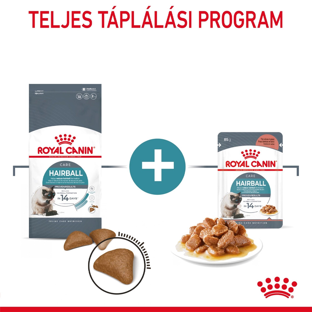 A ROYAL CANIN Hairball Care két különböző nedves eledel kivitelben is kapható: gravy és jelly formában. A nedves és száraz eledel keveréke biztosítja a macskák által kedvelt változatosságot. Míg a száraz tápok fogtisztító hatást fejtenek ki és könnyebben tárolhatók, addig a nedves eledel nedvességtartalma segíti a hidratációt és a húgyutak egészséges működését.