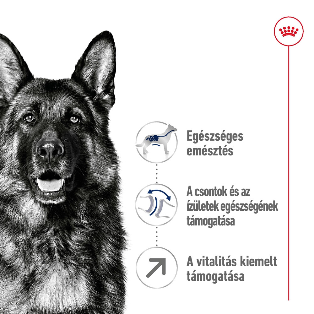A ROYAL CANIN Maxi Adult 5+ egy táplálási szempontból teljes értékű és kiegyensúlyozott formula kutyák számára, 5 éves kortól, amelyet kifejezetten a nagytestű kutyája sajátos igényeinek kielégítésére, illetve a késő felnőttkori évei alatt történő támogatására terveztek.