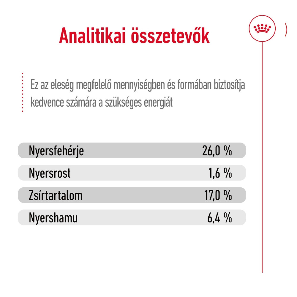 Royal Canin Maxi Adult 5+ (26-45 kg) Száraz Kutyatáp • Könnyen emészthető fehérjék és kiegyensúlyozott élelmi rost-tartalom az egészséges emésztés fenntartásáért.• Létfontosságú tápanyagok és ásványi anyagok az egészséges csontok és ízületek támogatásáért• Vitaminkomplex a vitalitás optimális támogatásáért• Adaptált tápszemcseméret a kutyája állkapcsához igazítva, a rágás elősegítéséhezNem számít hány évesek, a nagyobb testű kutyáknak nagyon eltérő táplálási szükségletei vannak a kisebb testű kutyákhoz képest. Ez azt jelenti, hogy a méretüknek megfelelő, testreszabott táplálásra van szükségük a késő felnőttkori éveik támogatása érdekében.A ROYAL CANIN Maxi Adult 5+ egy táplálási szempontból teljes értékű és kiegyensúlyozott formula kutyák számára, 5 éves kortól, amelyet kifejezetten a nagytestű kutyája sajátos igényeinek kielégítésére, illetve a késő felnőttkori évei alatt történő támogatására terveztek.A nagyobb testű kutyák a hosszabb idejű bélpasszázsuk miatt sokkal hajlamosabbak az emésztőrendszeri érzékenységekre, mint a kisebb fajták. A tápszemcse könnyen emészthető fehérjéket és kiegyensúlyozott rostellátást tartalmaz az emésztőrendszer egészségének támogatása érdekében.A nagyobb testű kutyák súlya általában 26 és 44 kg között mozog, és súlyuk nagy részét az ízületeikre helyezik. Ez a különleges ásványianyag- és tápanyag-kombinációval készült formula az egészséges csontok és ízületek támogatására lett szabva.A felnőtt kutyája különleges tápanyagokat igényel az egészsége megőrzése érdekében. Ezt a létfontosságú vitaminok komplexével készült formulát arra tervezték, hogy segítsen fenntartani felnőtt kutyája vitalitását.A nagyobb testű kutyafajták jellemző állkapocsszerkezetét figyelembe véve a tápszemcsénk egyedi mérete és alakja révén igazodik kutyája állkapcsához és elősegíti, hogy alaposan megrágja az eledelt.A ROYAL CANIN Maxi Adult két nedves eledeles textúrával is kapható: pépes, illetve falatok pecsenyelében. A nedves és száraz eledel keverésével történő vegyes táplálásváltozatosságot hoz kutyája étrendjébe, így érdekesebbé és élvezetesebbé válnak az étkezések. A száraz tápszemcse egy mechanikus fogtisztító hatást kelt, mely segít az egészséges fogak fenntartásában, míg a nedves eledel nedvességtartalma segít kutyája megfelelő folyadékbevitelében, illetve húgyúti egészségének megőrzésében.Minden ROYAL CANIN termék egy átfogó minőségellenőrzési folyamaton megy keresztül, ezzel garantálva a kiváló minőségű eledeleket.Tudósokból álló szakembergárdánk kifejezetten az Ön nagytestű kutyájának különleges táplálási szükségleteire szabott formulákat hoz létre, kiváló minőségű tápanyagok felhasználásával és a környezet-tudatosság figyelembevételével.Összetétel: Dehidratált baromfifehérjék, állati zsiradékok, kukorica, búza, búzaliszt, kukoricaliszt, árpa, kukoricaglutén, búzaglutén, hidrolizált állati fehérjék, répapép, ásványi anyagok, halolaj, szójaolaj, élesztőtermékek, psyllium (útifű) maghéj és mag, frukto-oligoszacharidok, algaolaj Schizochytrium sp., erjesztéssel előállított glükózamin, hidrolizált porc (kondroitin forrás)Analitikai összetevők: Nyersfehérje: 26,0 %, Nyersrost: 1,6 %, Zsírtartalom: 17,0 %, Nyershamu: 6,4 %Tápértékkel rendelkező adalékanyagok/kg: A-vitamin: 21800 NE, D3-vitamin: 1000 NE, Vas (3b103): 36 mg, Jód (3b201, 3b202): 3,6 mg, Réz (3b405, 3b406): 11 mg, Mangán (3b502, 3b504): 47 mg, Cink (3b603, 3b605, 3b606): 131 mg, Szelén (3b801, 3b811, 3b812): 0,06 mgTechnológiai adalékanyagok/kg: Üledékes eredetű klinoptilolit: 10 g, Tartósítószerek, Antioxidánsok